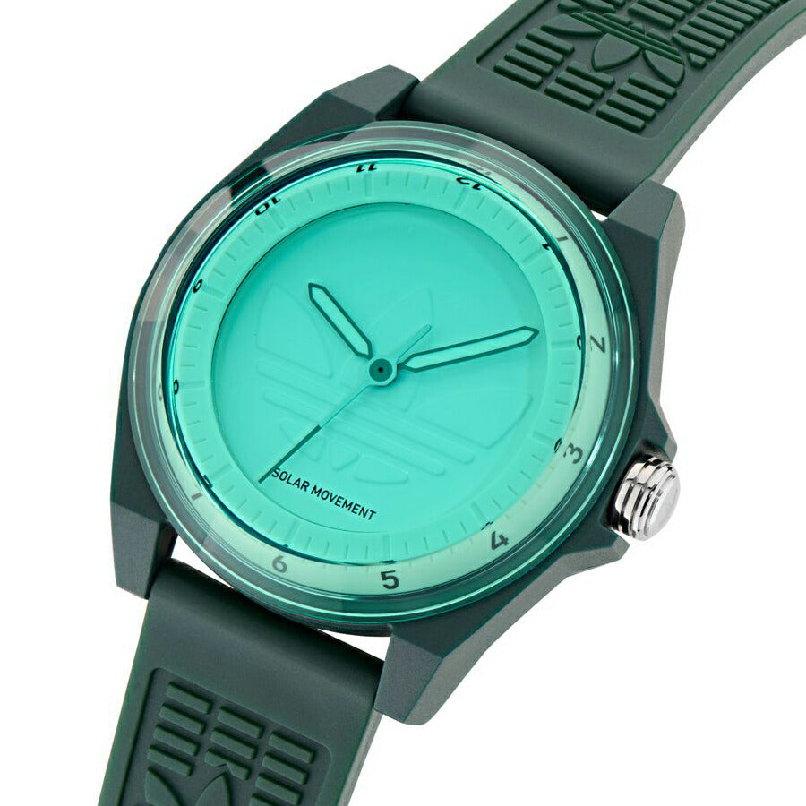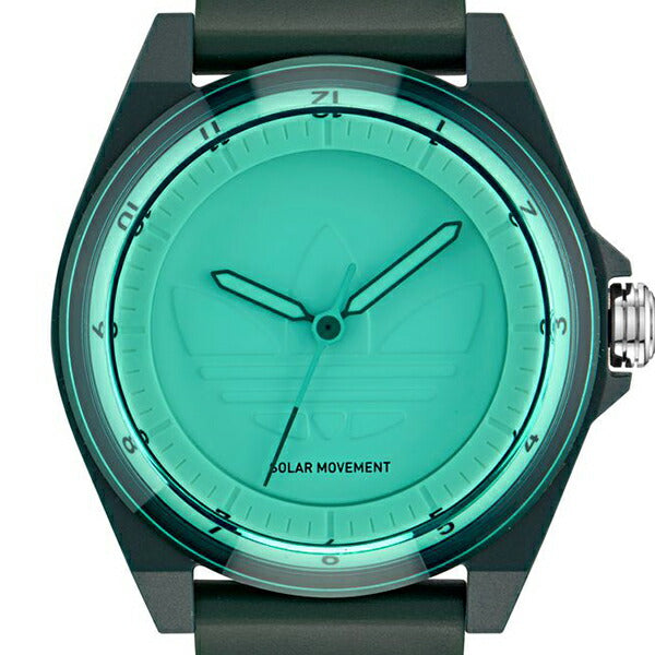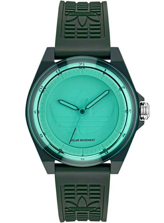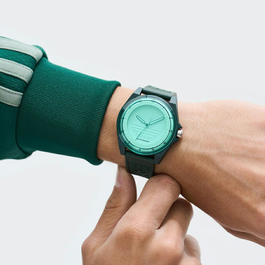 グリーンのケースとストラップには軽量な樹脂素材を採用し、スポーティーで快適な着け心地を実現。ムーブメントには日本製ソーラークオーツを搭載し、日光や室内光で充電可能。