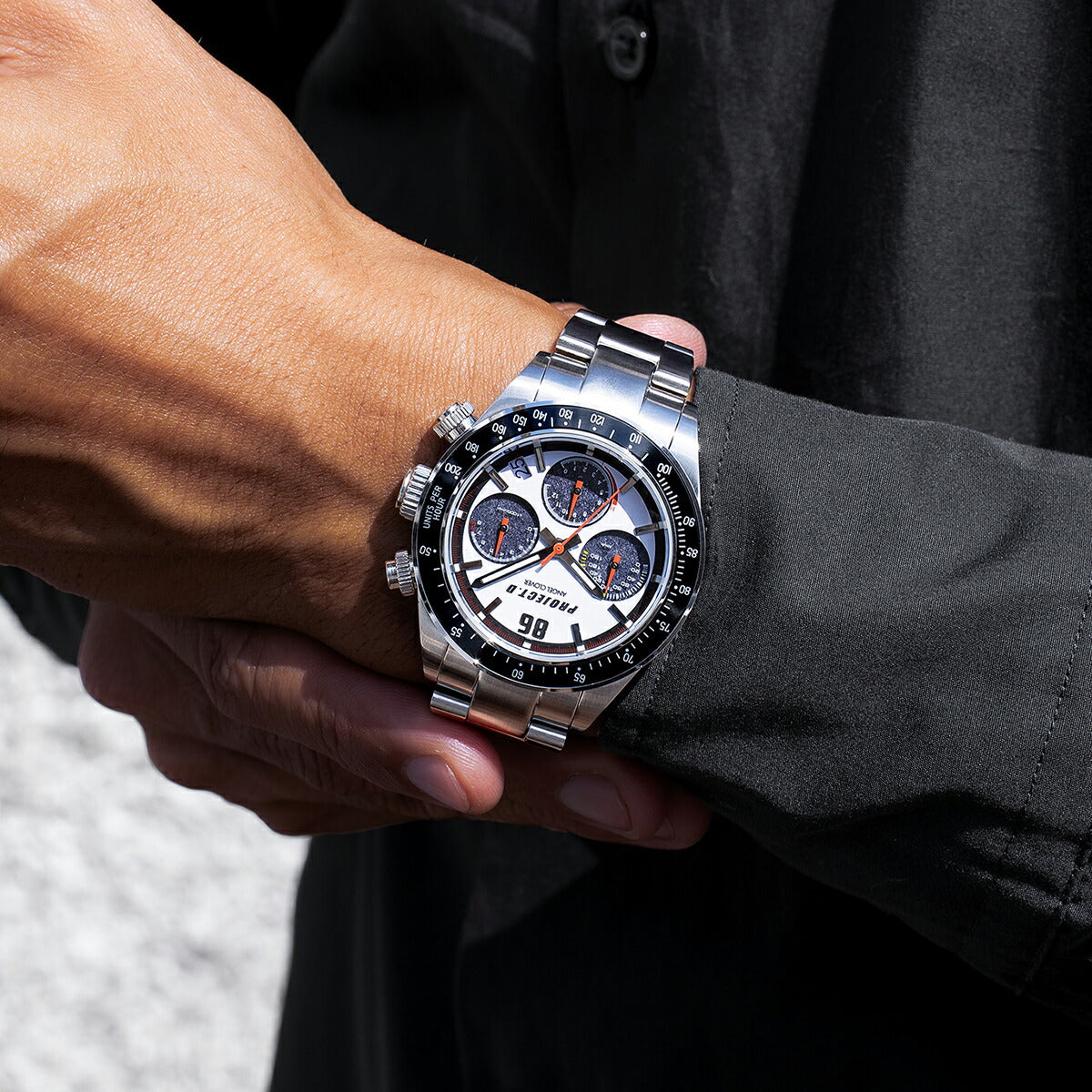 12時位置には型式番号「AE86」の“86”を象徴するインデックスを配置。ダイヤル内の3つのサブダイヤルは、実車メーターをイメージして設計されており、9時位置にはスピードメーター、3時・6時位置にはタコメーターを思わせるデザインを採用。