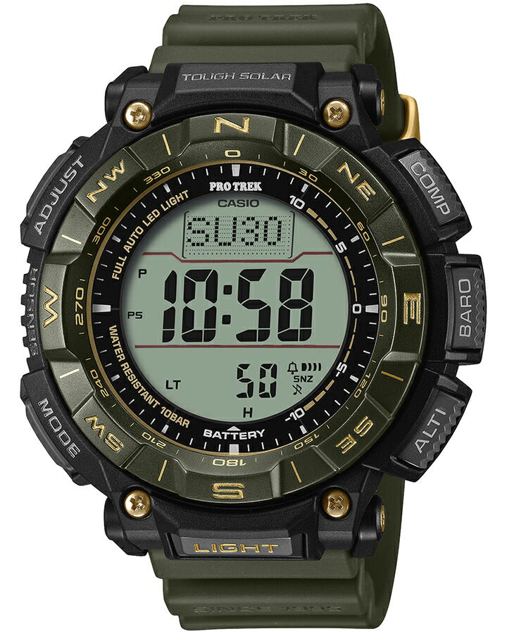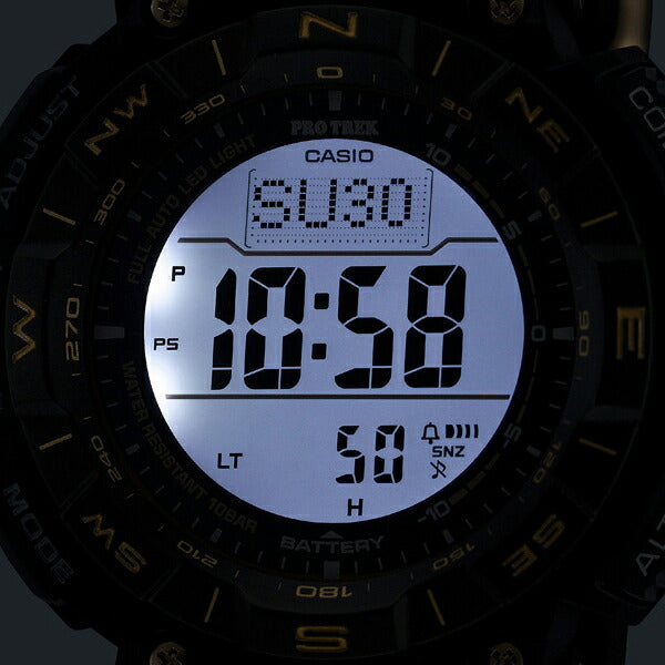 | センサー機能 | 高度計測機能/相対高度計(計測範囲:-700 ~ 10,000m)、高度メモリー(計測月日・時刻・高度を最大30本マニュアルメモリー、自動記録データ:最高/最低高度、オート積算(上昇/ 下降)メモリー)、登山記録データ14本(最高/最低高度、オート積算(上昇/下降)メモリー)、高度差計測(-3,000~3,000m)、計測間隔設定機能(5秒/2分毎)※最初の3分間のみ1秒毎 気圧計測機能(計測範囲:260~1,100hPa)、気圧傾向グラフ表示(過去42時間分を表示)、気圧差グラフィック、気圧傾向インフォメーションアラーム(特徴的な気圧の変化が起こった場合に矢印と報音でお知らせします) 方位計測機能:16方位・方位の角度(0 ~359°)を計測、方位連続計測(60秒)、東西南北をグラフィック表示、ベアリングメモリー(方位の角度、記録した方向を示すグラフィックを1本メモリー)、磁気偏角補正機能、方位補正機能 温度計測機能(計測範囲:-10~60℃) |