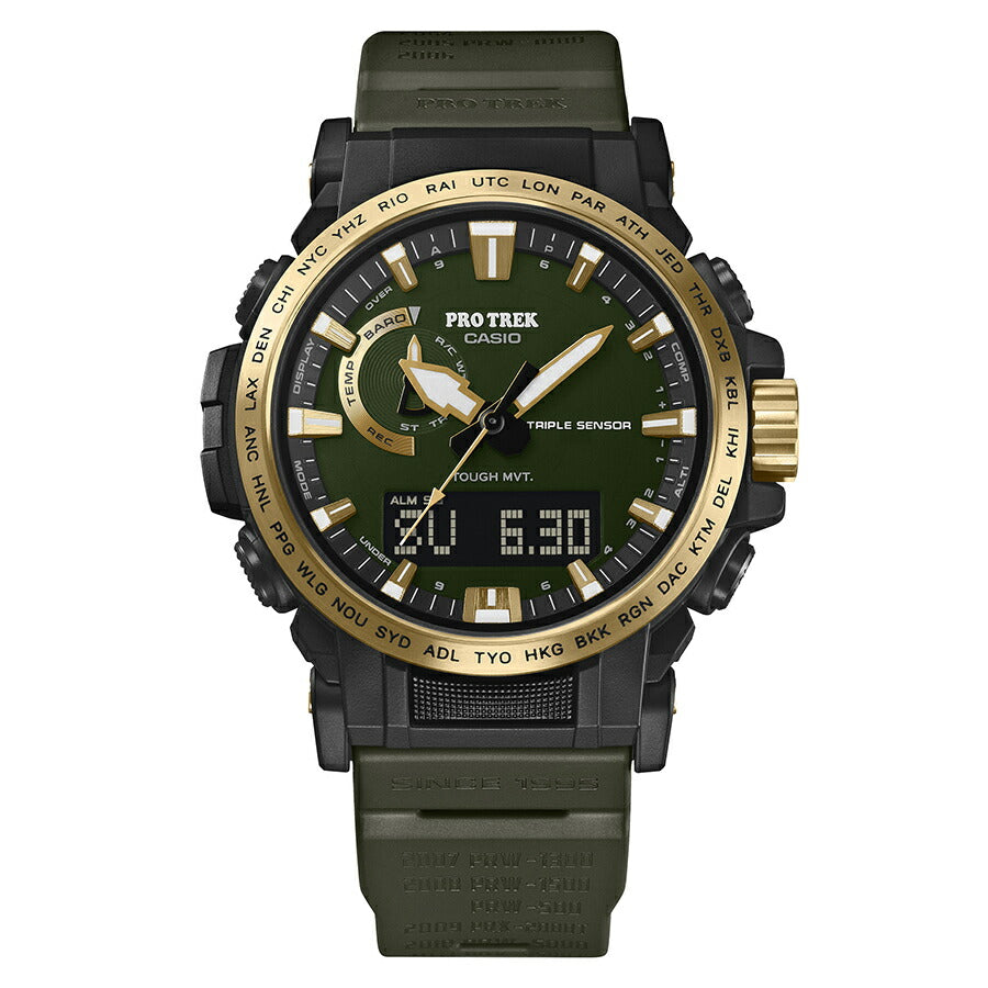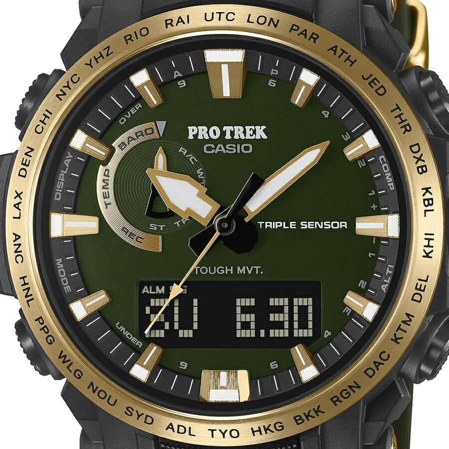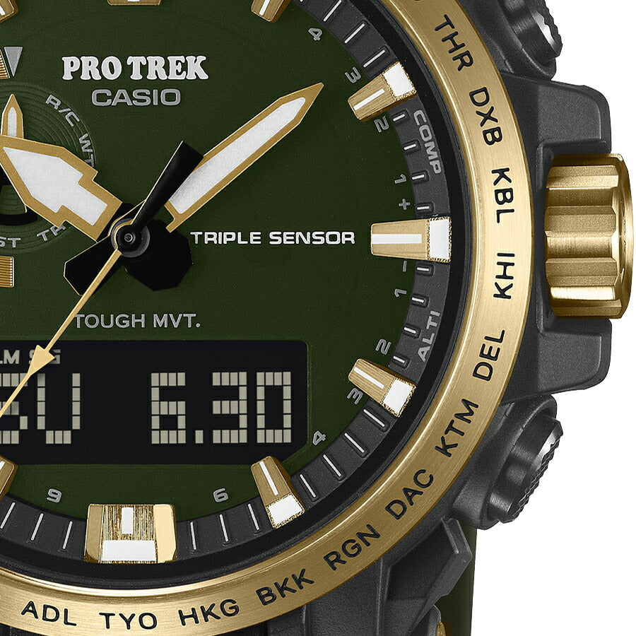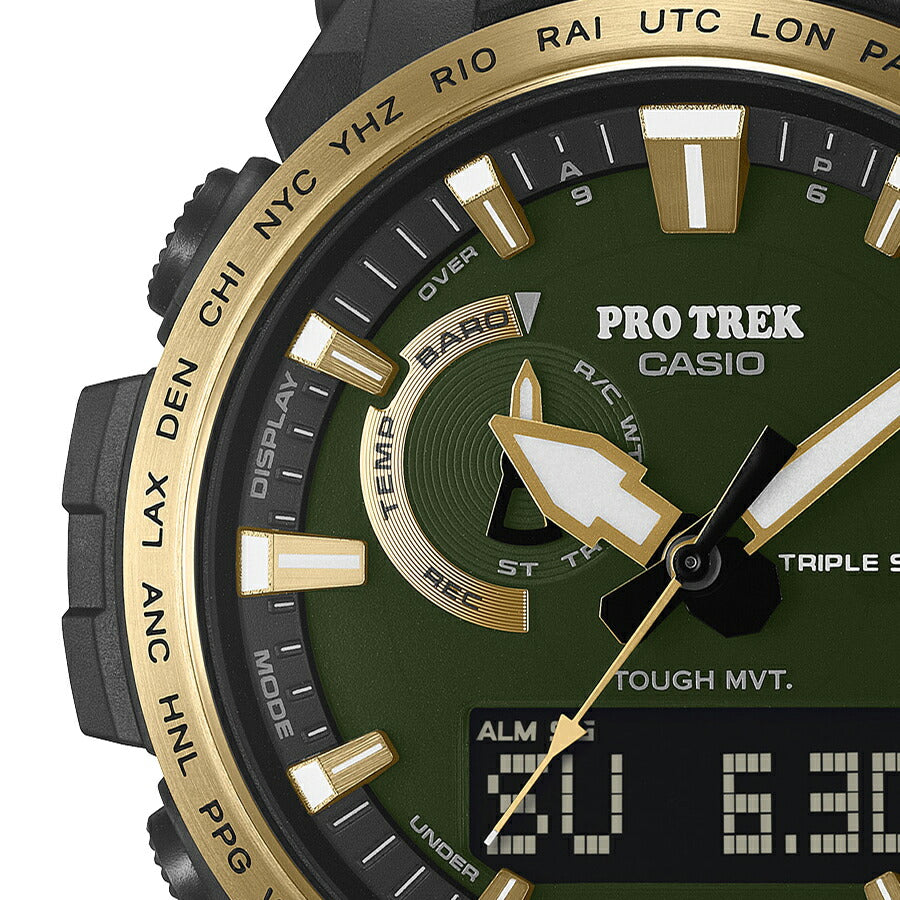 PRO TREK史上初の文字板蒸着を採用したアナログ・デジタルコンビネーションモデル。世界6局の電波を受信するマルチバンド6機能で、常に正確な時刻を表示します。