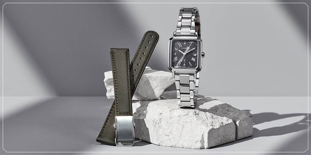 優しくフェミニンなクロスシーらしいケースライン。軽く、薄く、大きすぎないサイズ感で、スクエアを柔らかな印象へ導きます。インデックスは、伸びやかなローマ数字をラウンドに配置しつつ、12時、6時、9時の輝くカットパーツはhikariコレクションの特長です。シーンに合わせて印象が変えられる付け替えバンドがセットされているので、ご自身で付け外しができるインターチェンジャブル構造を採用。メタルバンドは、好みの長さに調節できるシンプルアジャストです。