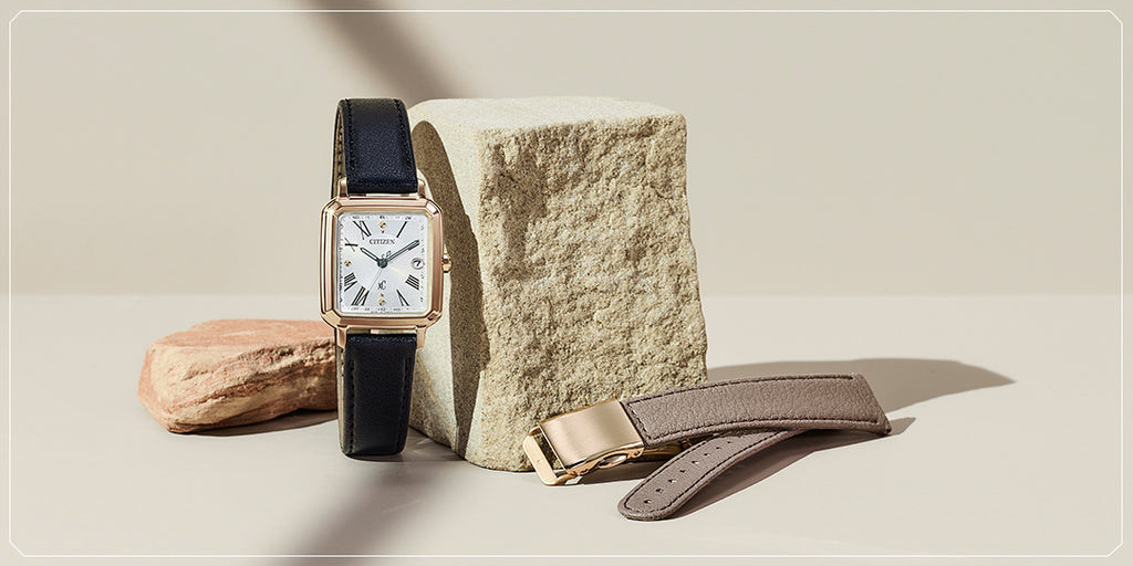 優しくフェミニンなクロスシーらしいケースライン。軽く、薄く、大きすぎないサイズ感で、スクエアを柔らかな印象へ導きます。インデックスは、伸びやかなローマ数字をラウンドに配置しつつ、12時、6時、9時の輝くカットパーツはhikariコレクションの特長です。シーンに合わせて印象が変えられる付け替えバンドがセットされているので、ご自身で付け外しができるインターチェンジャブル構造を採用。メタルバンドは、好みの長さに調節できるシンプルアジャストです。