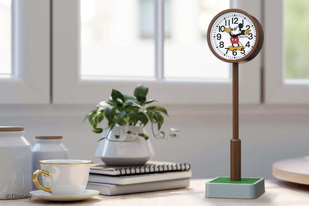 公園などに設置されているポール型アウトドアクロックをモチーフにした置時計より、ミッキーマウスの両手で時刻を表示する定番のデザインのディズニーモデルが登場です。ポール時計との組み合わせでスペシャルな雰囲気を演出します。