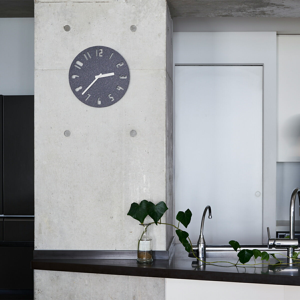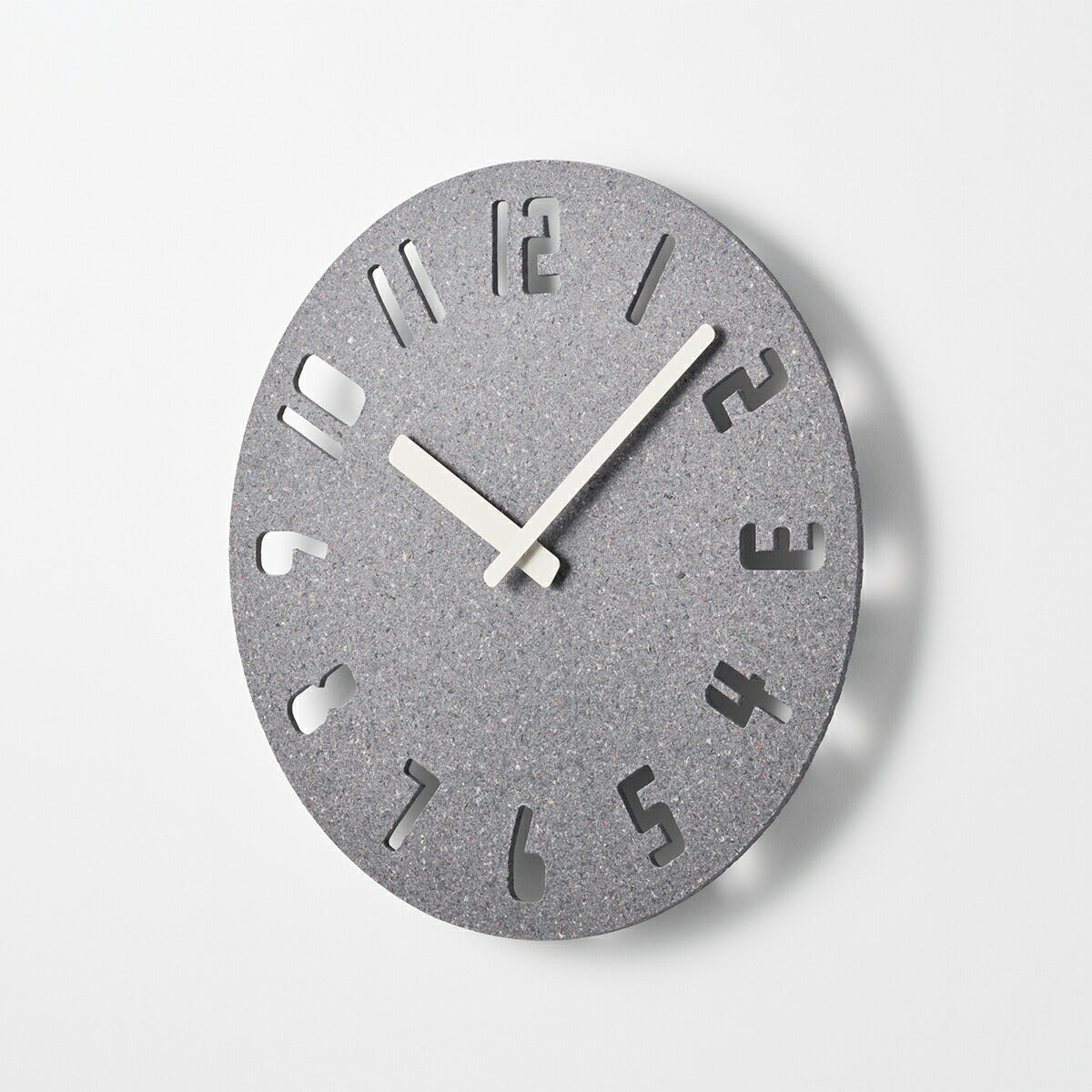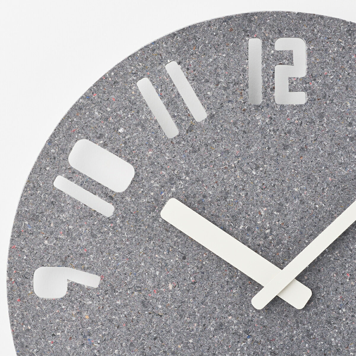 廃棄衣料品で作られる板は全てに微妙な色や模様の違いがあり、同じものが2つとなくその違いを楽しめることも特徴の一つです。また、使われなくなった時計は回収し、再びマテリアルに戻り、新たな時計として生まれ変わります。紙や木材の型抜きを行うトムソン加工で切り抜き、素材の表情をそのまま生かしたミニマルなデザインのこの時計は空間に馴染むアートピースであり、静かに時の経過を知らせるプロダクトでもあります。