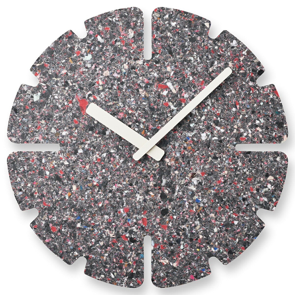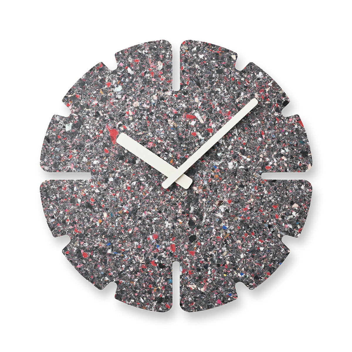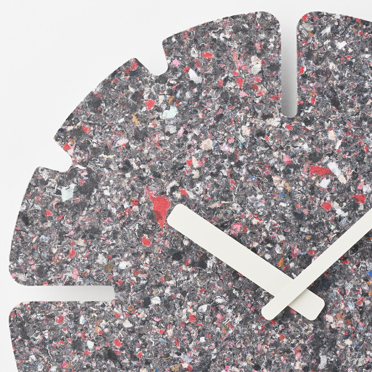 廃棄衣料品で作られる板は全てに微妙な色や模様の違いがあり、同じものが2つとなくその違いを楽しめることも特徴の一つです。また、使われなくなった時計は回収し、再びマテリアルに戻り、新たな時計として生まれ変わります。紙や木材の型抜きを行うトムソン加工で切り抜き、素材の表情をそのまま生かしたミニマルなデザインのこの時計は空間に馴染むアートピースであり、静かに時の経過を知らせるプロダクトでもあります。