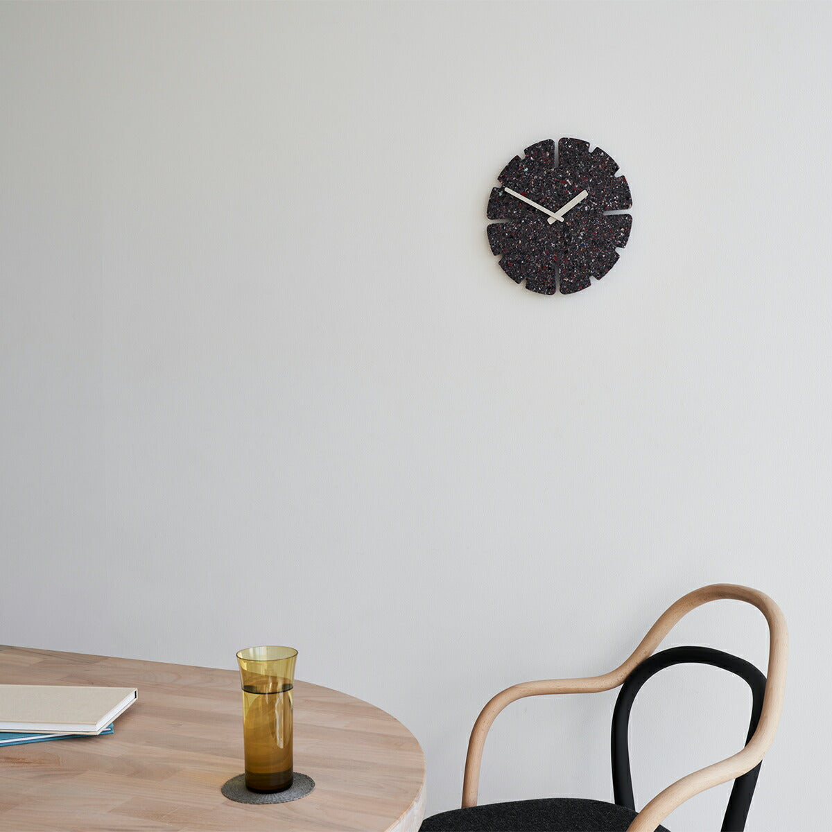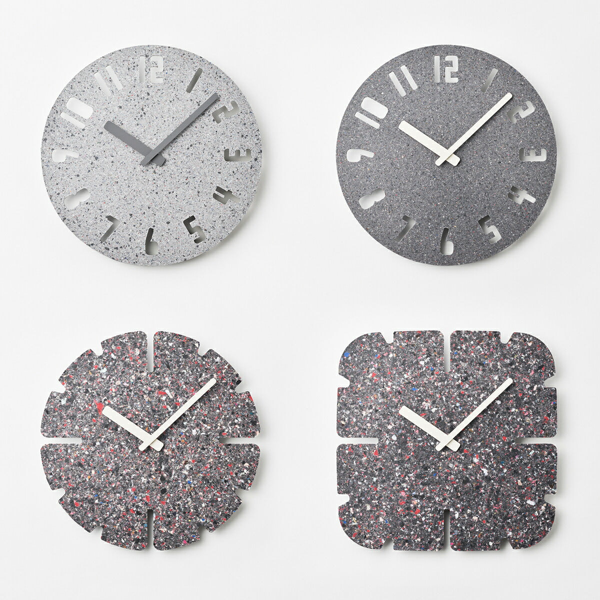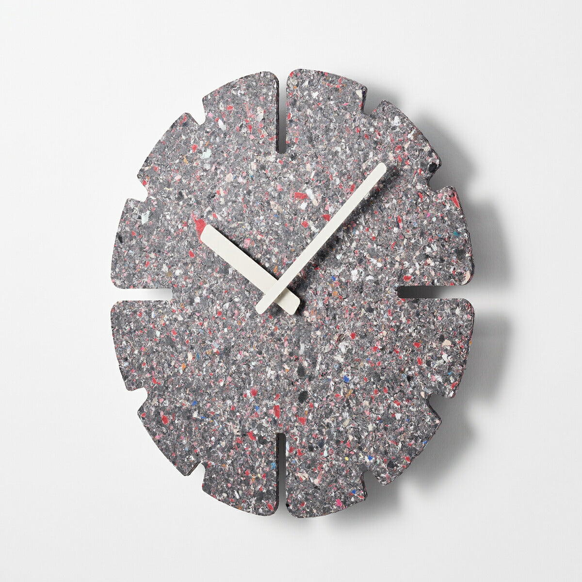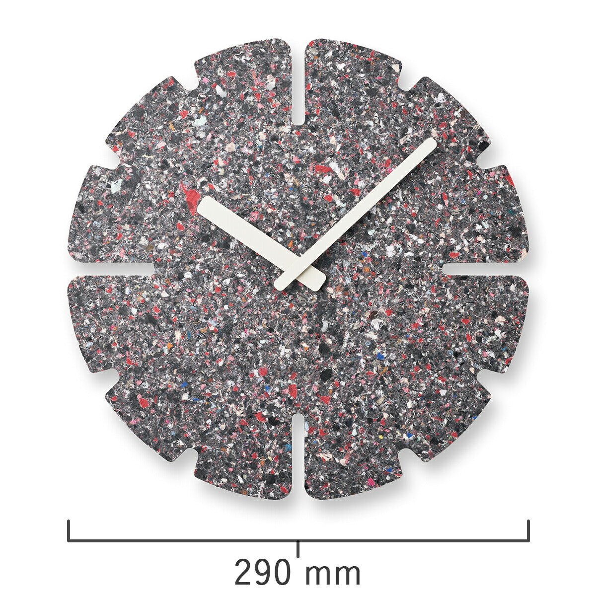 廃棄衣料品で作られる板は全てに微妙な色や模様の違いがあり、同じものが2つとなくその違いを楽しめることも特徴の一つです。また、使われなくなった時計は回収し、再びマテリアルに戻り、新たな時計として生まれ変わります。紙や木材の型抜きを行うトムソン加工で切り抜き、素材の表情をそのまま生かしたミニマルなデザインのこの時計は空間に馴染むアートピースであり、静かに時の経過を知らせるプロダクトでもあります。