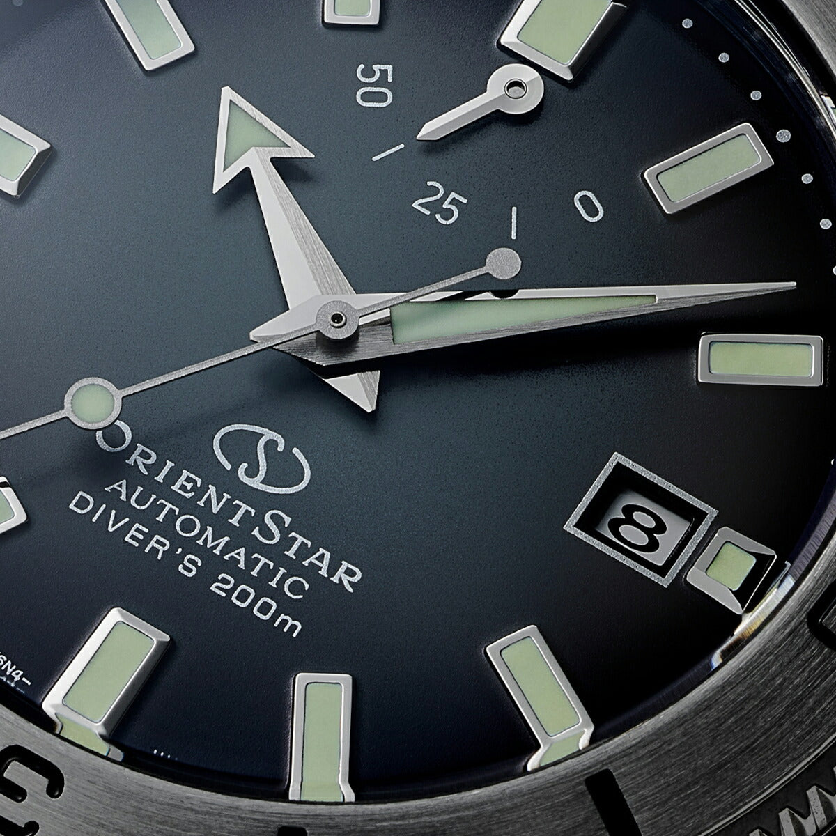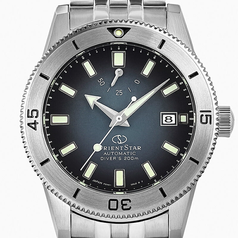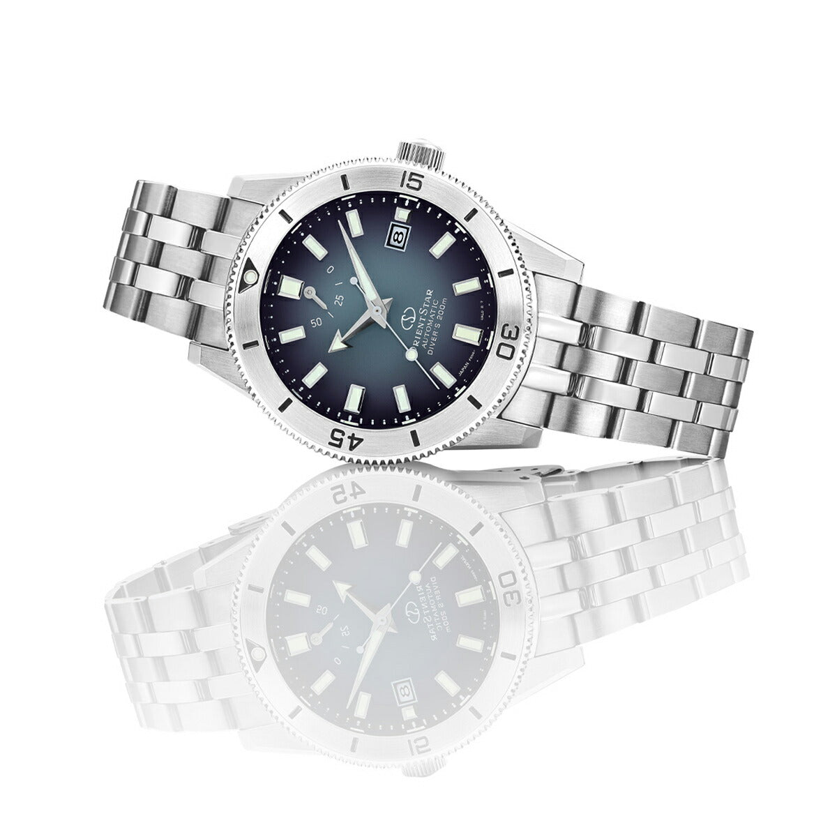 文字板のテーマは「夜空と深海」。中心のブルーグレーから外周へと沈み込むようにブラックへ移ろうグラデーションは、星明かりを映す海面から深海へ続く情景を想起させます。アロー型の時分針や立体的なカットインデックスは視認性を高めつつ、1960年代のダイバーズに通じる力強い表情を演出。無垢のステンレススチール製回転ベゼルや、りゅうずガードを設けないケース形状など、オリジナルの意匠を丁寧に踏襲しています。