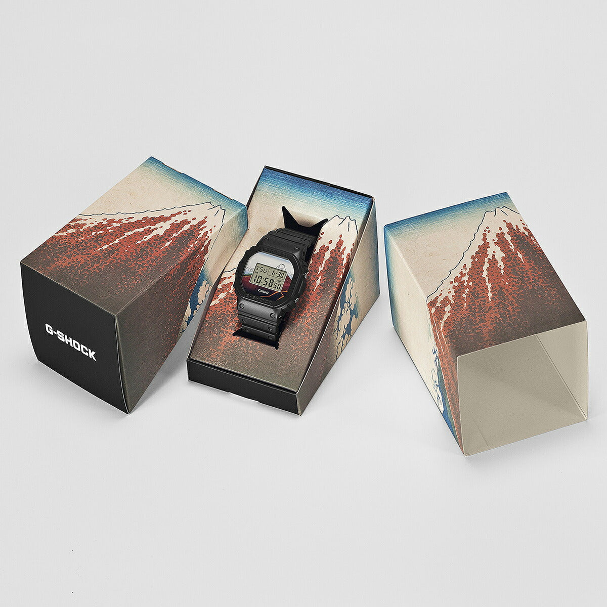 ベースモデルにはアイコニックな定番デジタルDW-5600を採用し、文字板には「山下白雨」を大胆にデザイン。LEDバックライト点灯時には文字板と一体となって同作品の雄大さを表現します。裏蓋には漢字で“日本”という文字を刻印しました。