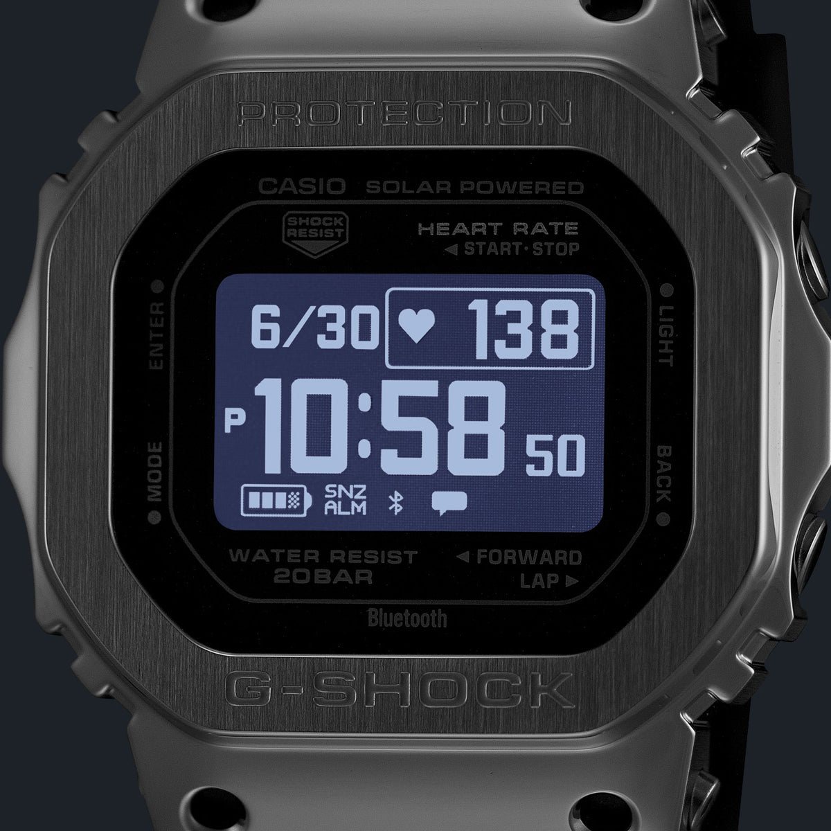 DW-H5600の機能はそのままに、ベゼル部分にステンレススチールを採用し、より幅広いシーンで着用できる仕上がりとしました。さらに、ベゼルのディンプル部分に4カ所の切削穴を設けることで、ハイテクギア感とスポーティーな印象を高めています。また、裏蓋にはカーボンファイバー強化樹脂ケースを採用。