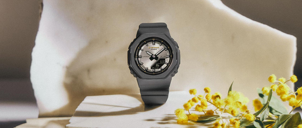 小ぶりなサイズ感とメタリックリングベゼルが印象的な、3月8日の国際女性デーを記念する特別なG-SHOCKです。
