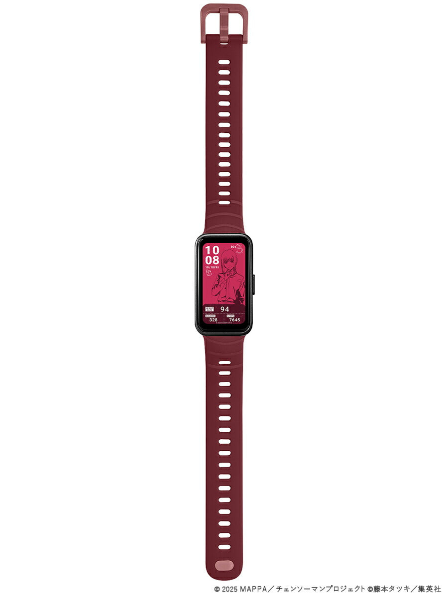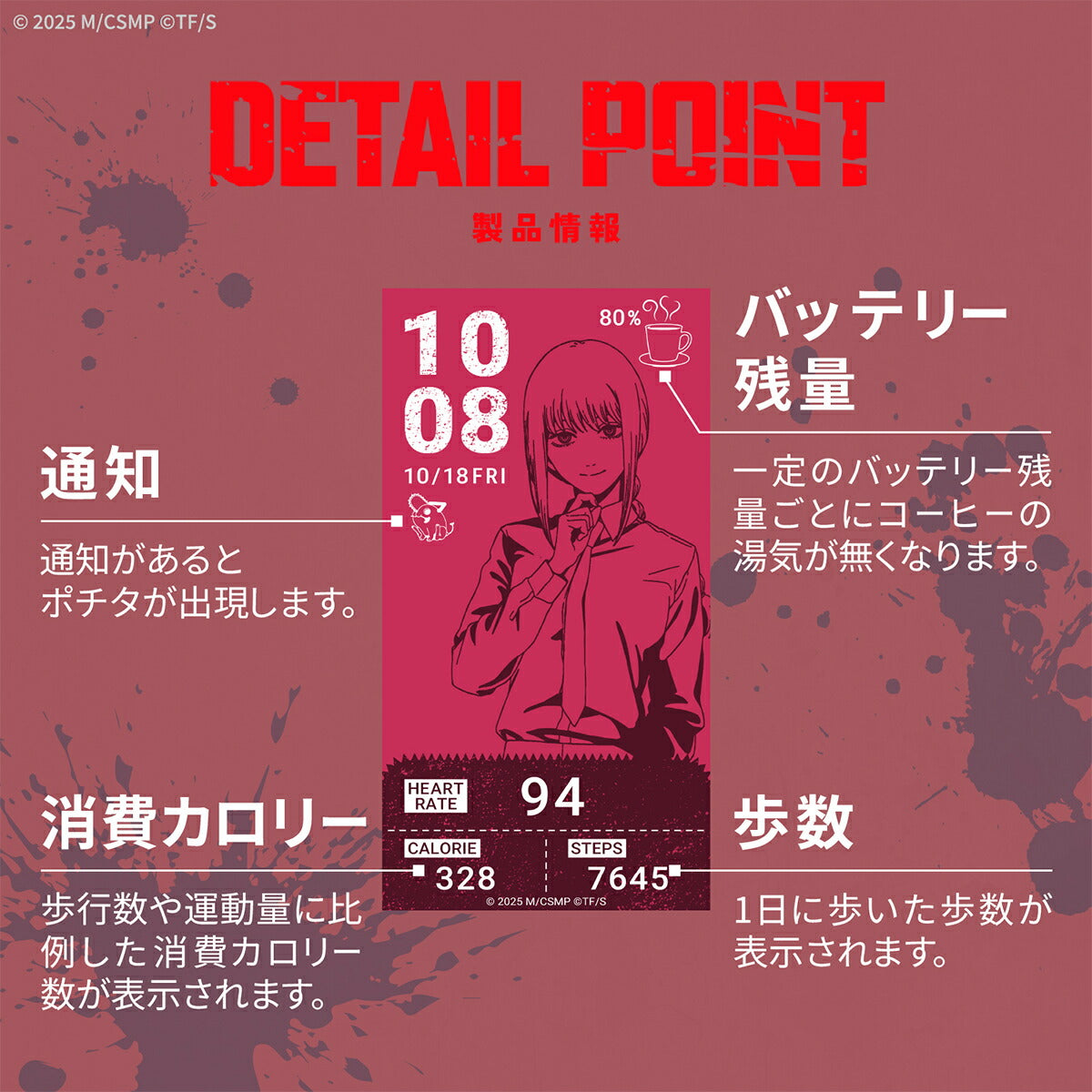 通知があるとポチタが出現し、歩数や消費カロリー、心拍数は赤を基調としたマキマモデル限定デザインで表示。深いレッドカラーのキャラクターモチーフバンドが腕元を引き締め、ユニセックスに使いやすい落ち着いたトーンで仕上げています。さらに、普段使いに合わせやすいブラックの替えベルトが付属しており、その日の気分に応じて雰囲気を切り替え可能。特製の劇場版デザインボックス入りで、コレクションとしても魅力的なアイテムです。