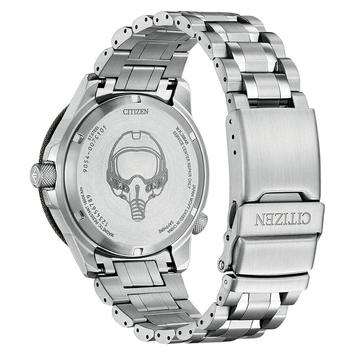 GMT機能を搭載したメカニカルモデルが「SKYシリーズ」初登場。ベゼルに24時間表記を施した王道のデザイン、りゅうず操作で時針が連動する本格的な仕様です。回転見返しリングと文字板(時字の外周)には、8時位置のりゅうずで操作のできる航空計算尺を装備。パイロットウオッチとしての本格機能を備えています。丸みを帯びたベゼルや、流れるようなデザインのケースとバンドを繋ぐラグは、飛行機の機体から着想を得ています。ヘアラインを多用したケースや、バンドの一部に鏡面仕上げを取り入れることで華やかな印象に仕上げております。裏ぶたには、パイロットが安心して身に着けられる道具の象徴として、航空ヘルメットを刻印しております。
