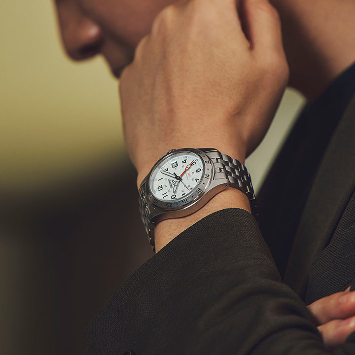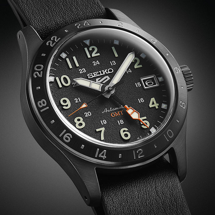 セイコー 5スポーツから、FIELDデザインシリーズを正統進化させたGMTモデルが登場です。ベースのデザイン・サイズは保ちつつキャリバースペックを進化させたFIELDデザインのフラッグシップモデルであり、固定ベゼル上面にGMT機能(24時)表記を入れ、 GMTモデルとしての存在感を高めたデザインが特長です。