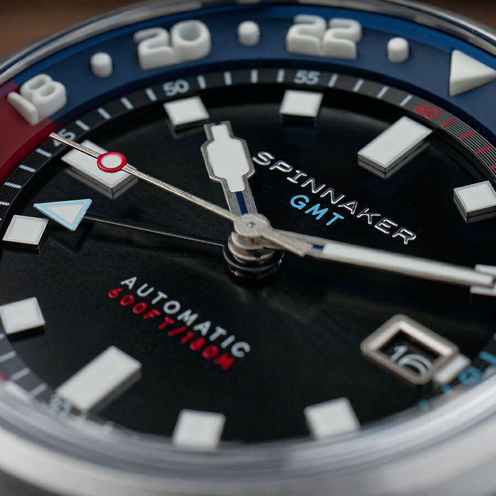 ダイヤルには、新たにGMT針を設置。先端が三角形で、秒針のドットとは色も異なり、区別しやすいよう配慮しています。24時間目盛りがついたインナーベゼルを利用することで、3つのタイムゾーンを把握できます。