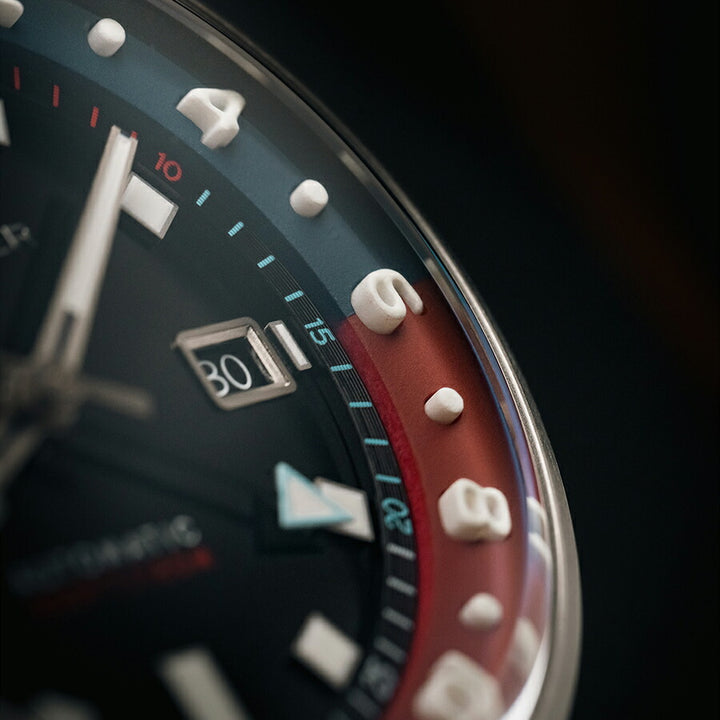 ブラッドナー GMT オートマティックにおいても、タイムレスな価値を生み出そうという精神は不変です。それは、ミニッツスケールの代わりに24時間目盛りを採用したインナーベゼルを見れば一目瞭然です。昼夜を分かつバイカラーに配色した上で、立体的に造形されたアラビア数字とドットをセット。屹立とした姿はインナーベゼルの傾斜によっても強調され、ケース内で優雅に回転する様子も楽しみになります。さらにはこの目盛りそのものが蓄光素材であり、暗所において力強く発光するさまは壮観です。