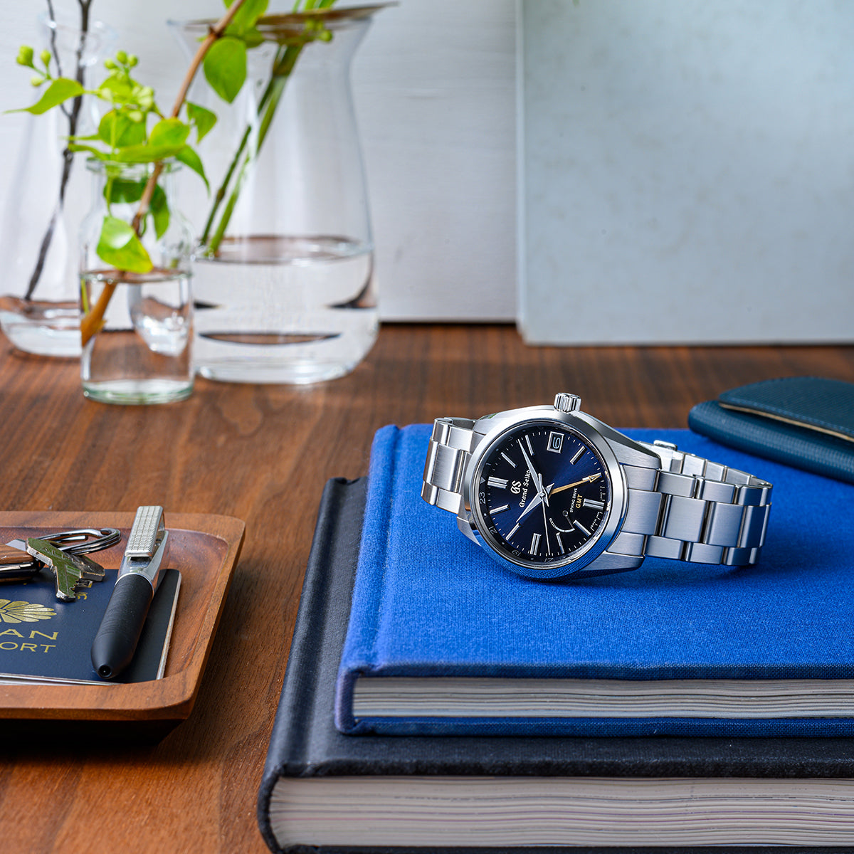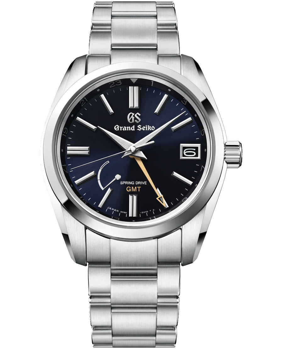 ダイヤルカラーは黒に近いミッドナイトブルーを採用し、グランドセイコーの王道デザインのケースと組み合わせたスプリングドライブGMTモデルです。