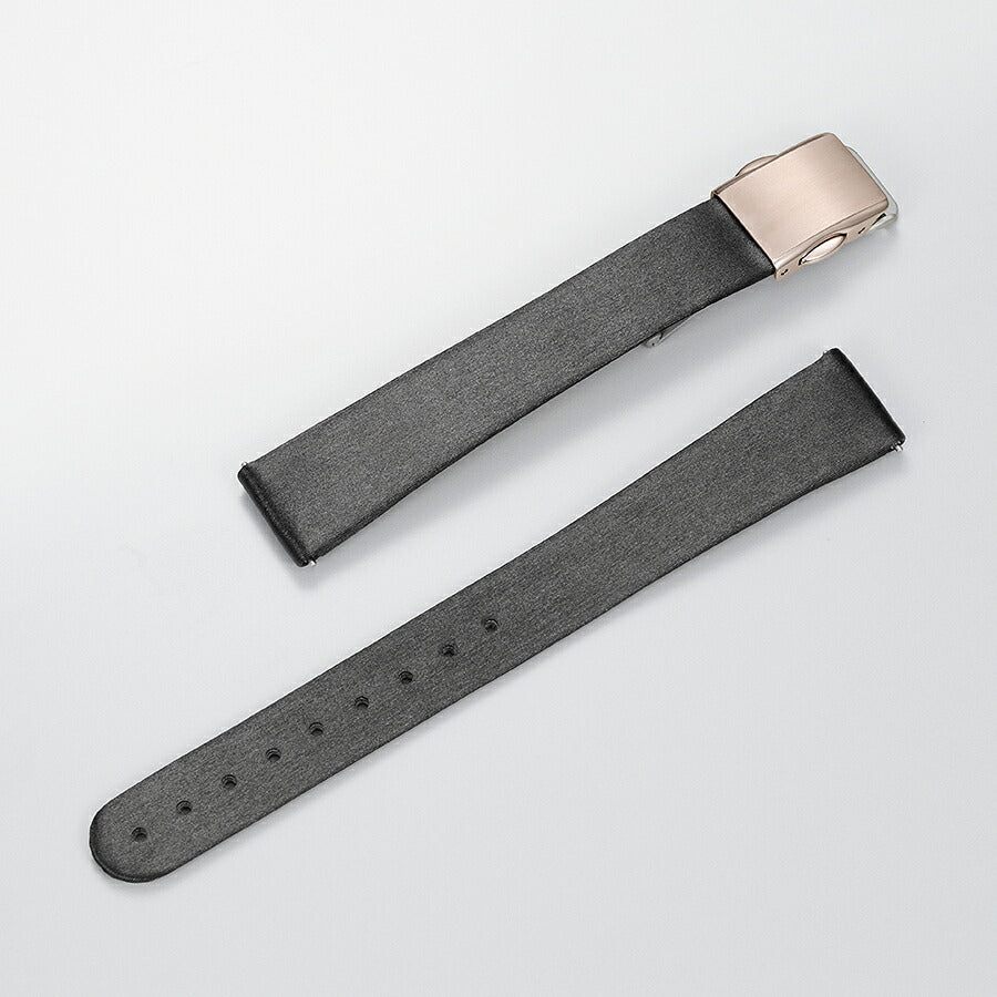 ダークグレーのサテン調バンドをセットした2Way仕様。その日の気分やシーンに合わせて、ご自身で簡単にバンドを交換できるインターチェンジャブル構造です。