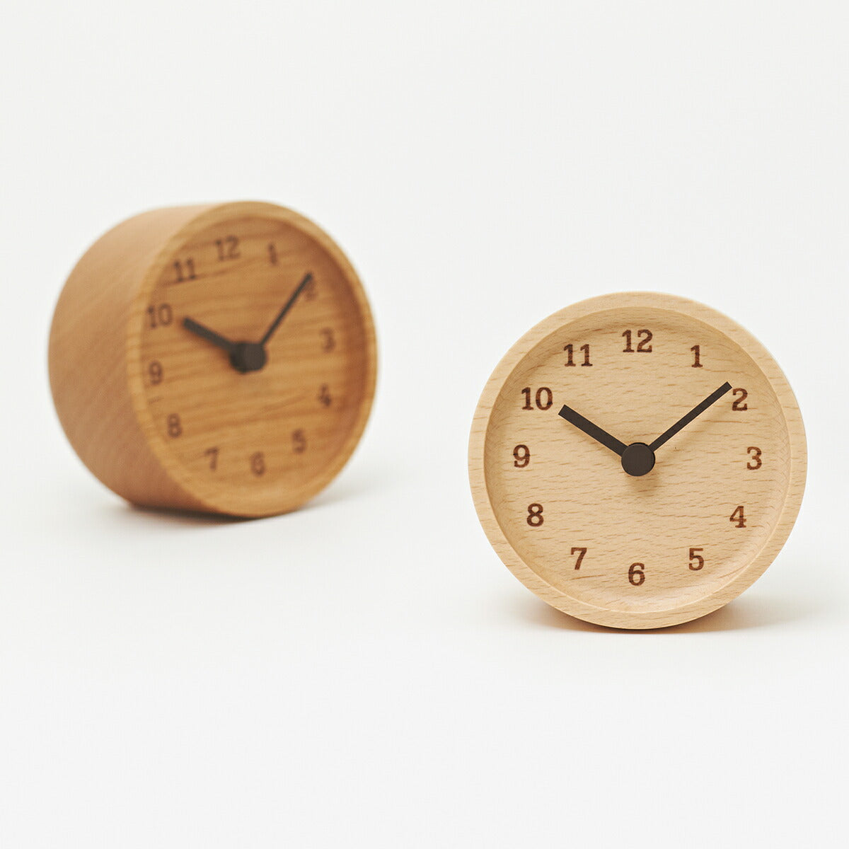 時計の枠をつくる製造過程で端材となった、無垢のウォールナット材を使うことが始まりでした。このヴォリューム感を活かしつつ、趣きがあるように、そんな思いから生まれた置時計です。思わず手に取りたくなるような、コロンとした形になるように、うしろを大きく丸く削り出せば、開口部に立体的な曲線が現れ、柔らかなフォルムに生まれ変わります。数字の指標は印刷のように“色”をのせるのではなく焼印による焦げを用いています。焦げの濃淡や、焼印を押した際につく凹みはそれぞれで、木目の表情とあいまって、同じものが2つとない味わい深いプロダクトです。(こちらのブナ材は端材ではありません)