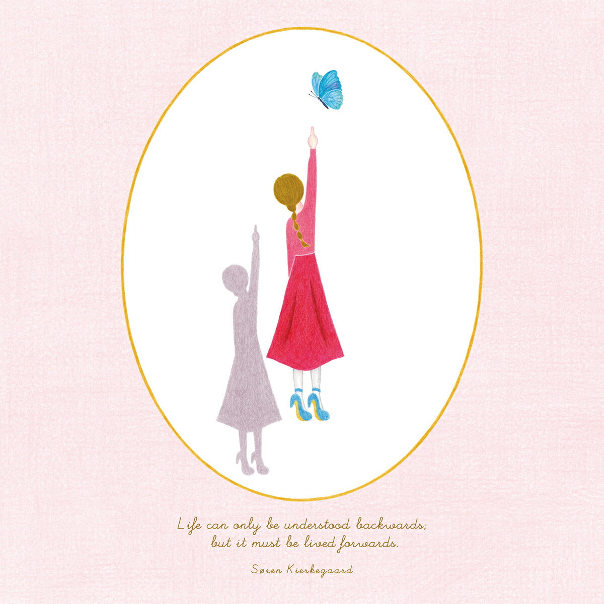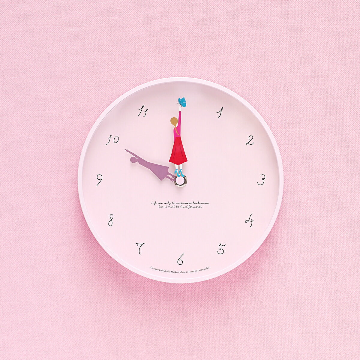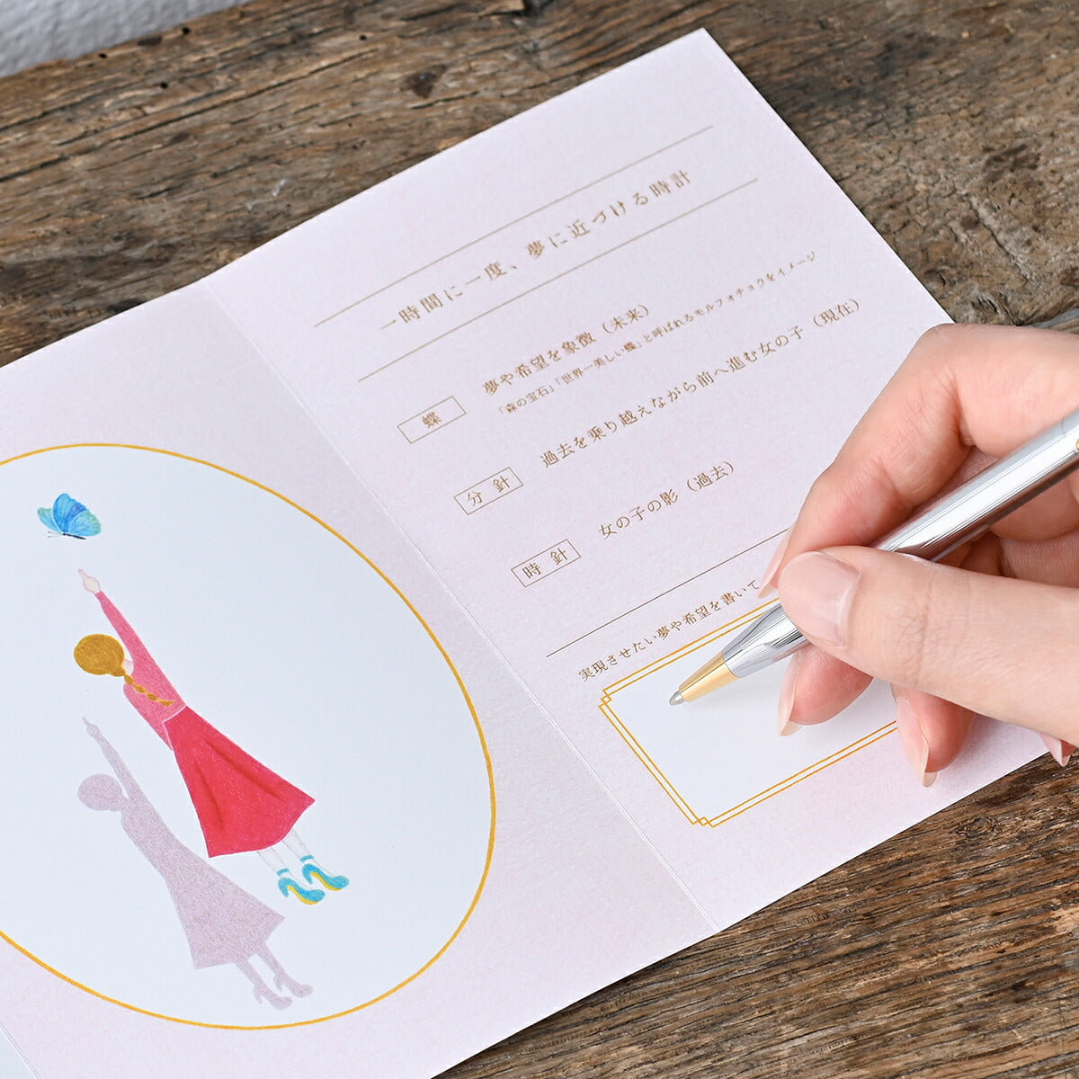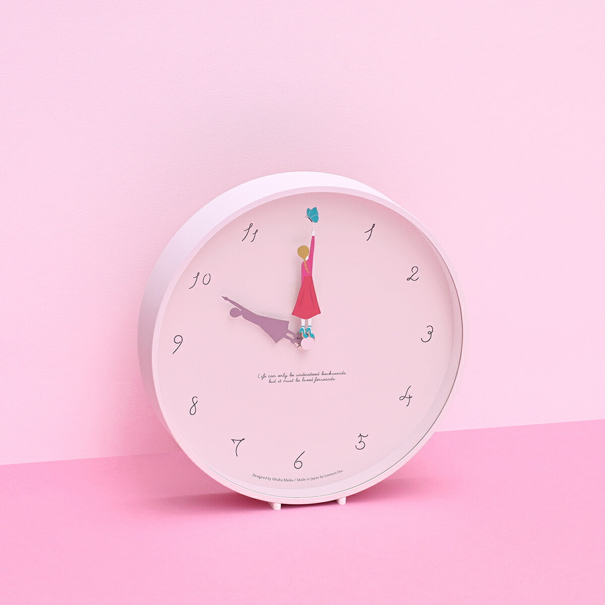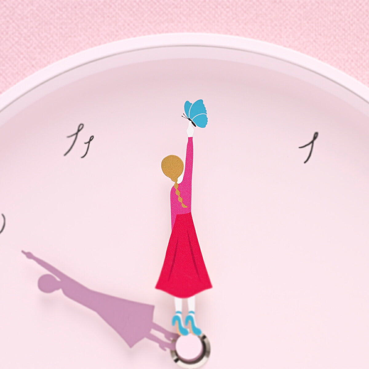 本体の12時をしめすところに「夢」を象徴するモチーフ(風船/蝶/流れ星)をあしらい、分針の女の子がモチーフのところまで進むと、それらを捕まえているように見える仕掛けとなっています。時針は女の子の「影」であり、「過去」を表し、分針は色々な「過去」を乗り越えながら前に進んでいく女の子の「現在」を表しています。