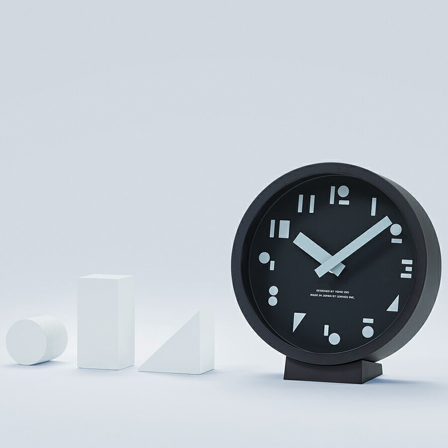 幾何学的な図形のあつまりを組み合わせていくと、数字に見えてきます。時刻を示すカタチは、リズミカルに配置され、あたらしいデザインクロックになりました。深みあるブラックに、アイスクリームのようなポップな配色の3色を加えた4色展開です。付属スタンドを外すと小ぶりなサイズの壁掛け時計としてインテリアのアクセントにもお使いください。