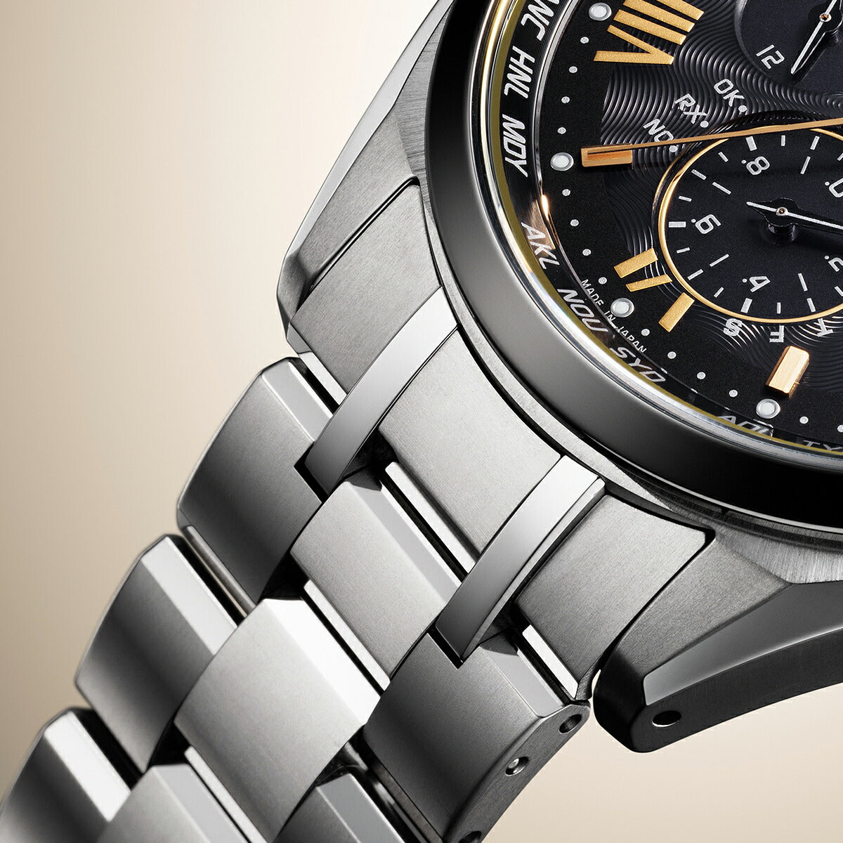 デュラテクトプラチナのケースとバンドが明るい輝きをプラス。デュラテクトDLCのベゼルが、全体の印象を引き締めています。サファイアガラスの外周は、蒸着で仕上げたゴールドのリングが輝きます。