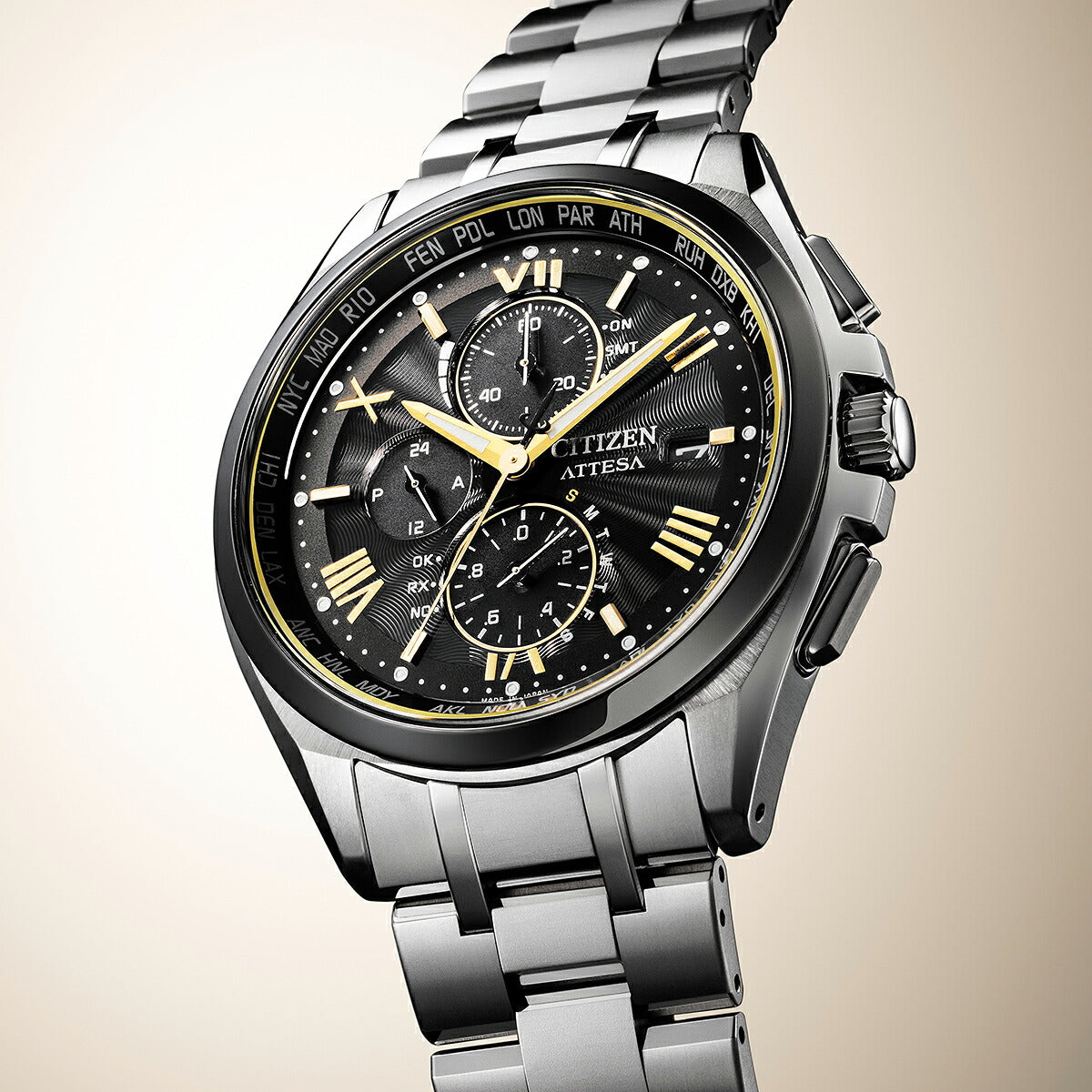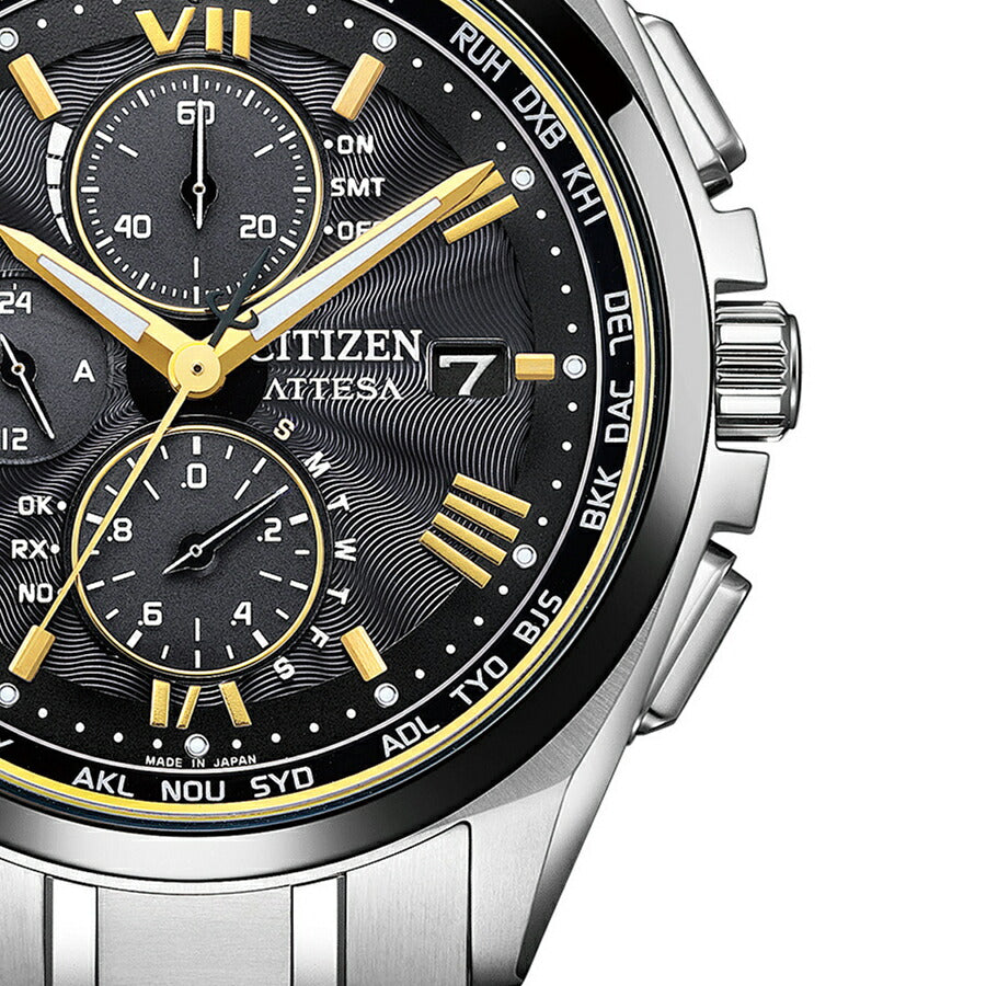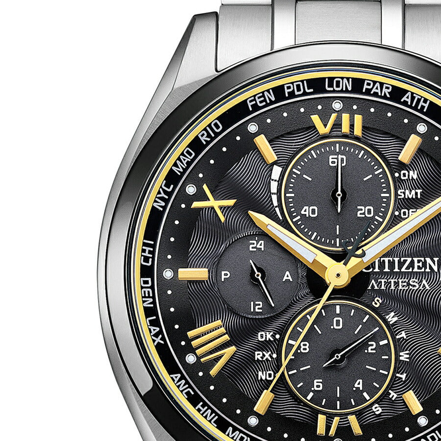 | 機能 | 充電量表示機能 充電警告機能 過充電防止機能 パワーセーブ機能 フル充電時約10ヶ月可動(パワーセーブ作動時) 日中米欧電波受信 受信局自動選択機能 定時受信機能 強制受信機能 パーペチュアルカレンダー デイ&デイト表示 24時間表示 1/20秒クロノグラフ(60分計) ダイレクトフライト ワールドタイム機能(26時差) サマータイム機能 パーフェックスマルチ3000(JIS1種耐磁、衝撃検知機能、針自動補正機能、世界4エリア受信) |