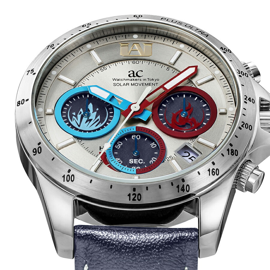 こちらのモデルは、氷と炎の“個性”を持つ轟焦凍をモチーフにデザイン。3時位置と9時位置のサブダイヤルには、氷結と炎熱をアイコニックなイラストとカラーリングで表現しました。