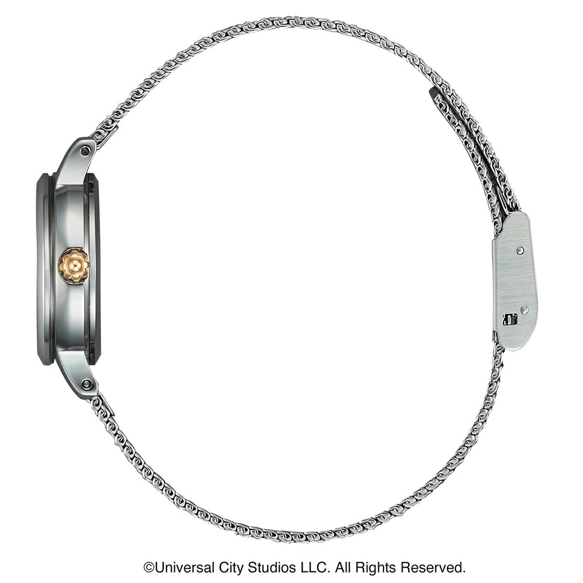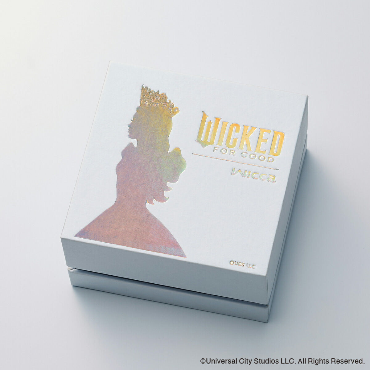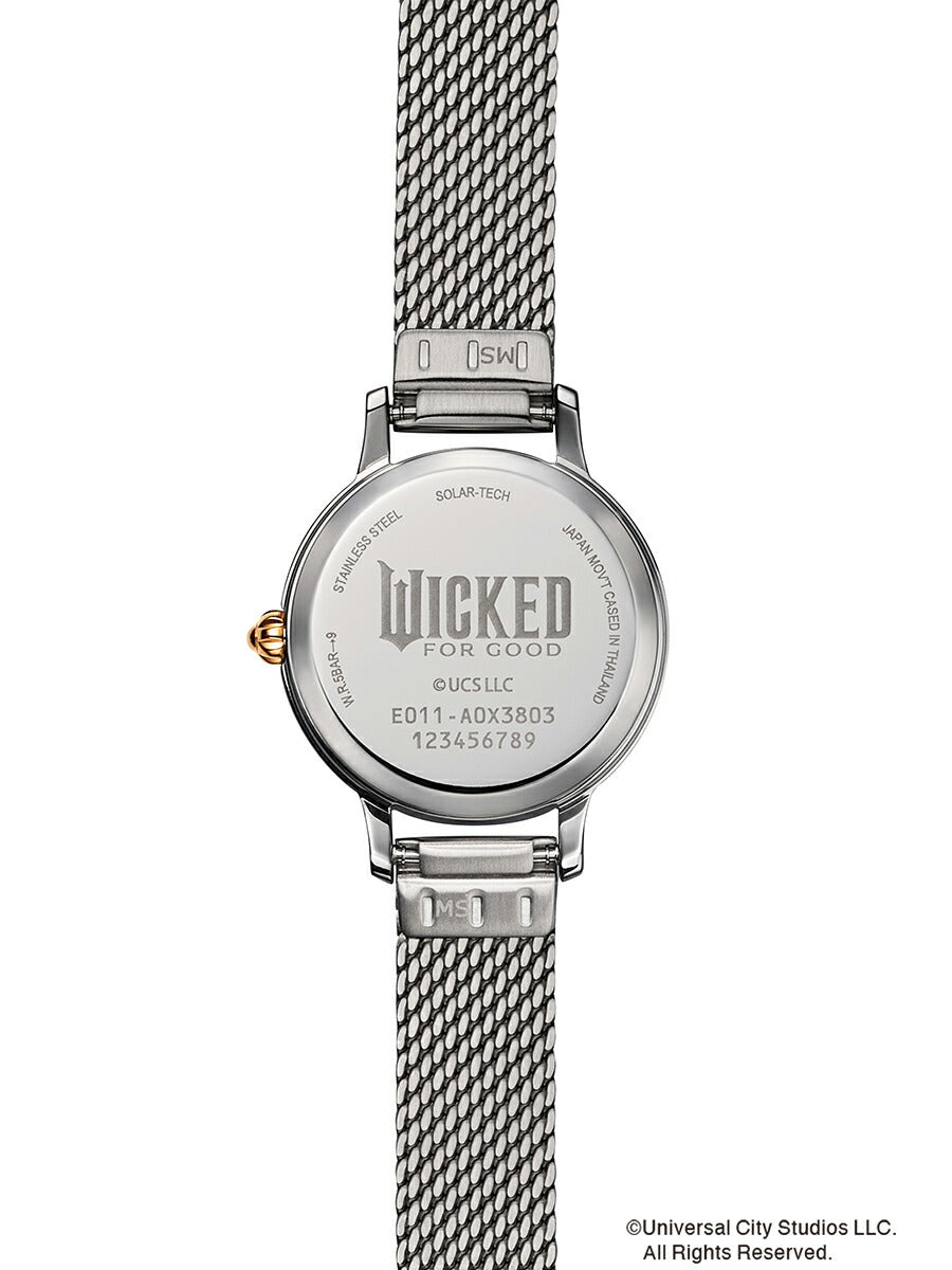 アリアナ・グランデが演じる“善い魔女”「グリンダ」をイメージ。艶やかな白蝶貝文字板とオーロラカラーのインデックスで、「グリンダ」のドレスを表現しました。白蝶貝文字板にお花や蝶をちりばめ、インデックスは「グリンダ」の女性らしい仕草やカールした髪、魔法の杖をイメージしてデザイン。2時と8時の位置にはオーロラカラーと淡いパープルのクリスタルガラスをセッティングしています。裏ぶたには『ウィキッド 永遠の約束』の原題『Wicked: For Good』のロゴを刻印。「グリンダ」のシルエットをあしらったスペシャルBOX付きです。