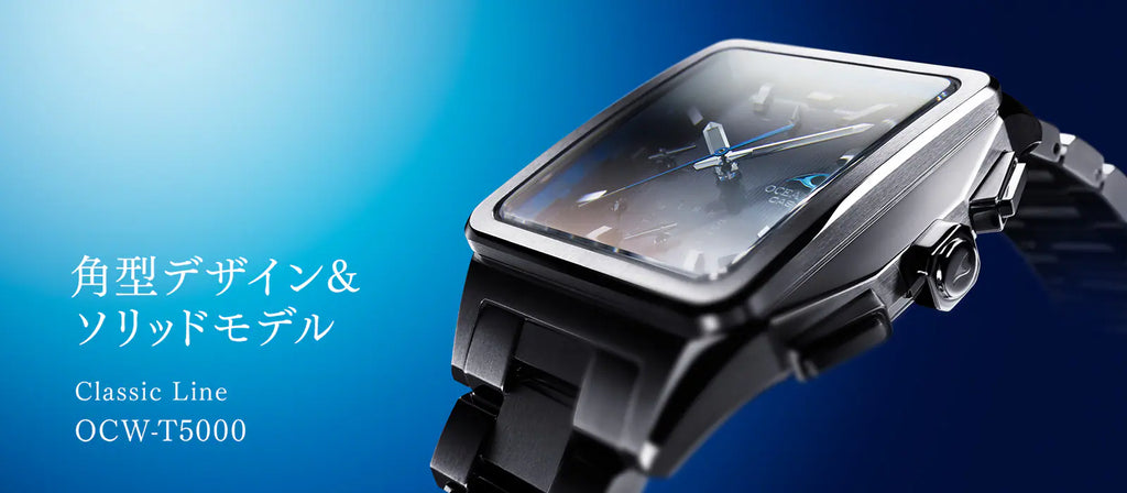 OCW-T5000は、角形のケースが特徴的なソリッドな電波ソーラーモデルです。