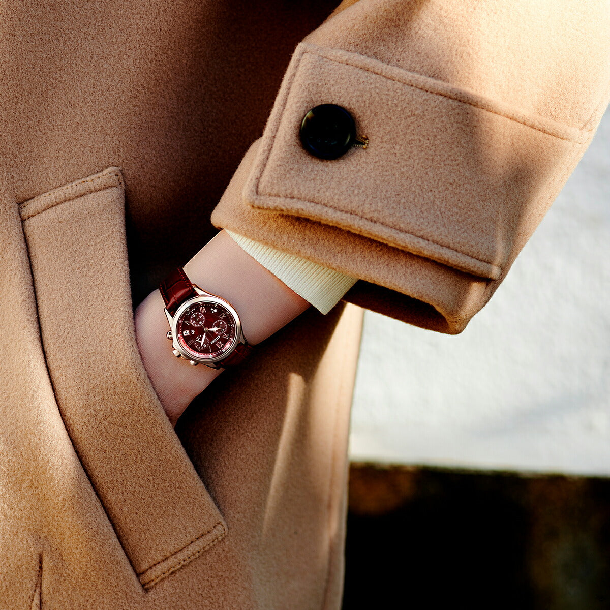 女性の腕になじみやすい、ミディアムサイズのエコ・ドライブクロノグラフ。サクラカラーのケースが肌を美しく見せる、クロスシーのbasic collection限定モデルです。