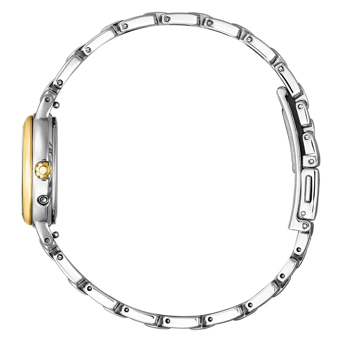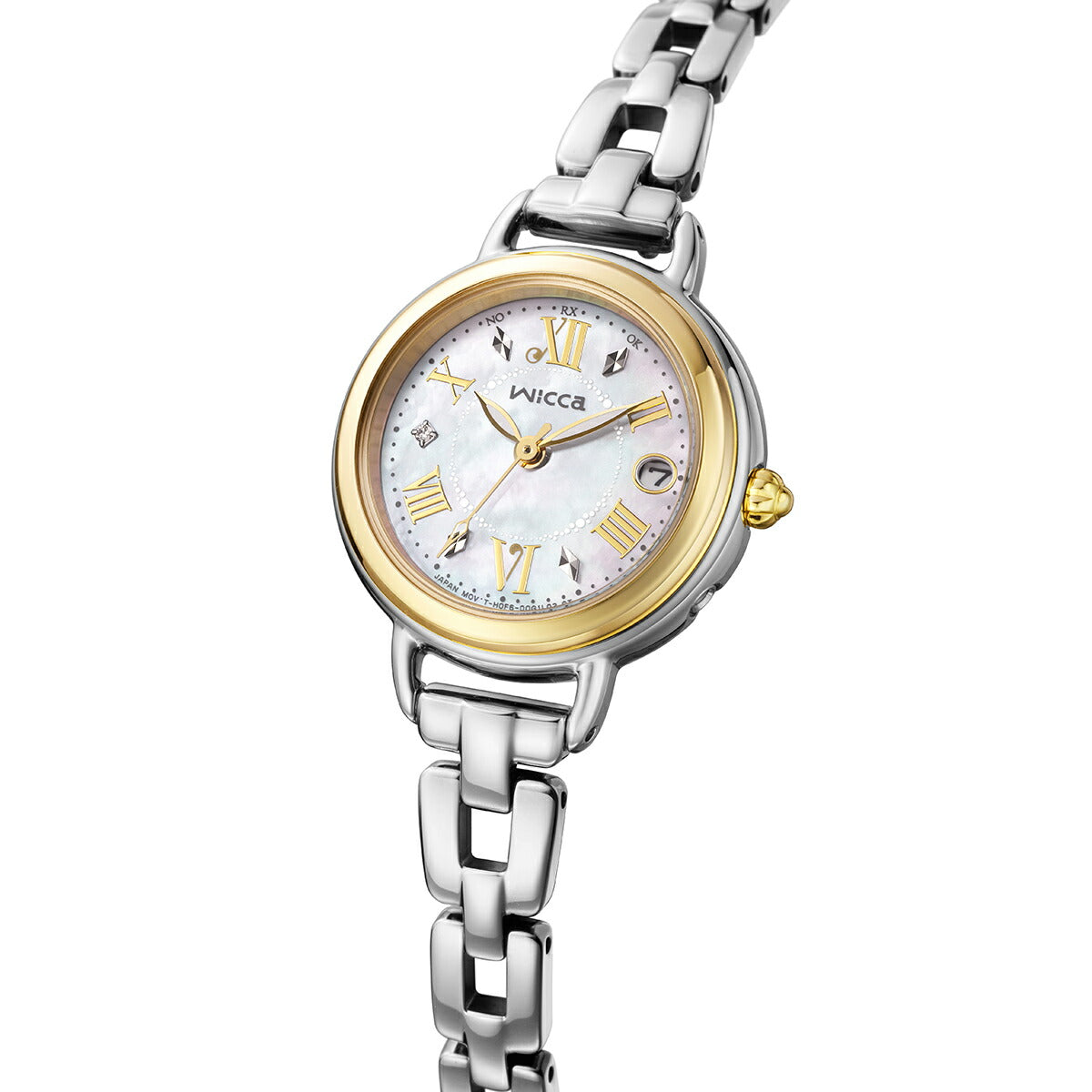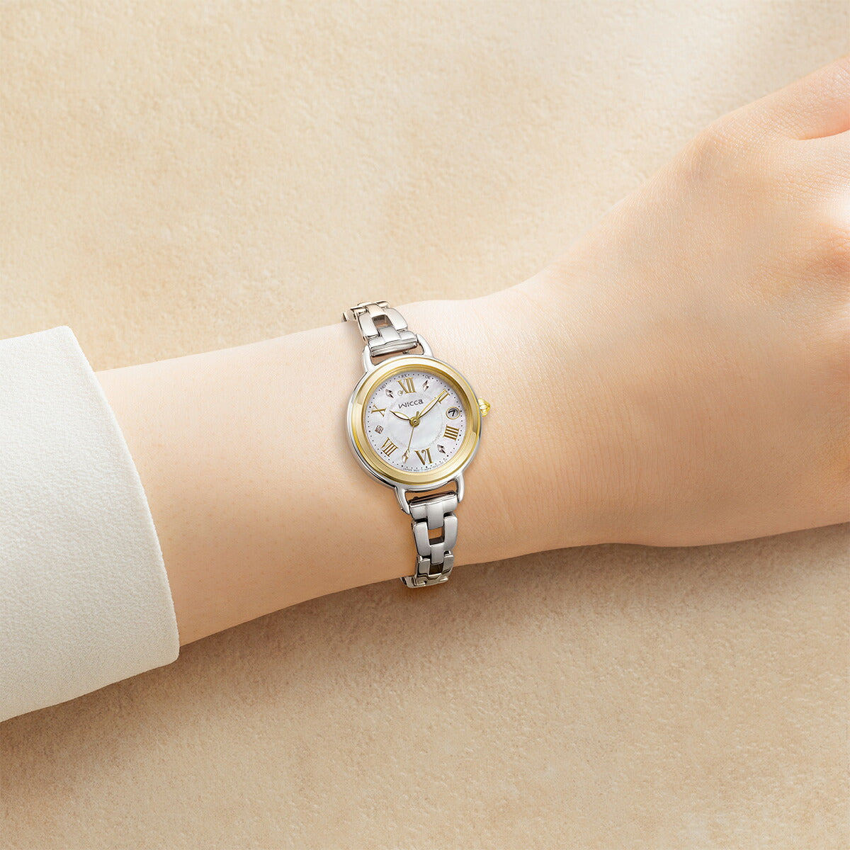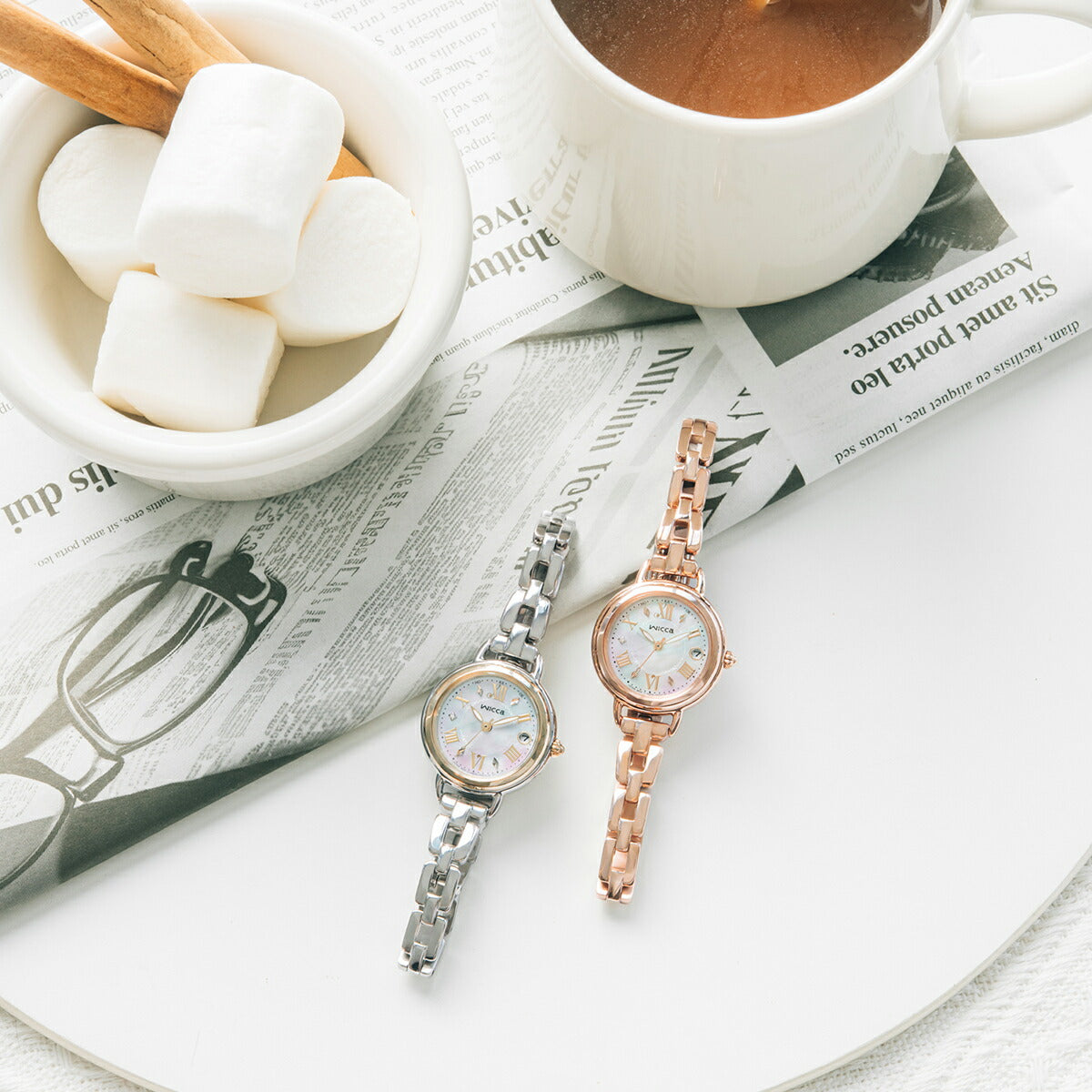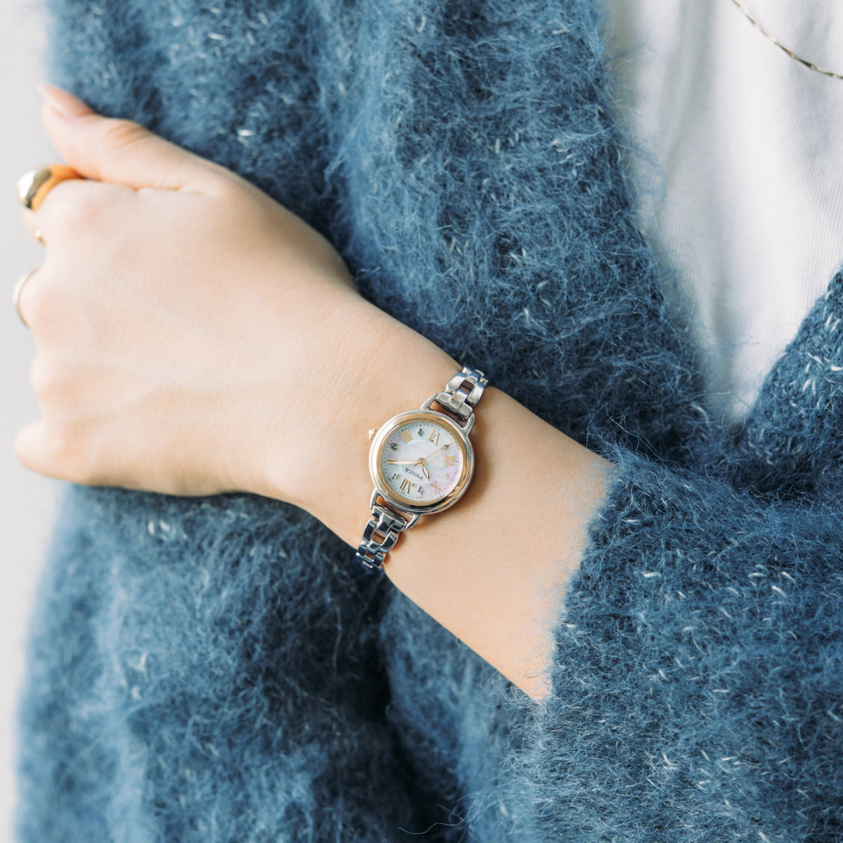 デザインのテーマは、「カフェタイム」。フェミニンで華奢なバンドに、白蝶貝文字板を組み合わせたアクセサリー感覚のソーラーテック電波時計です。
