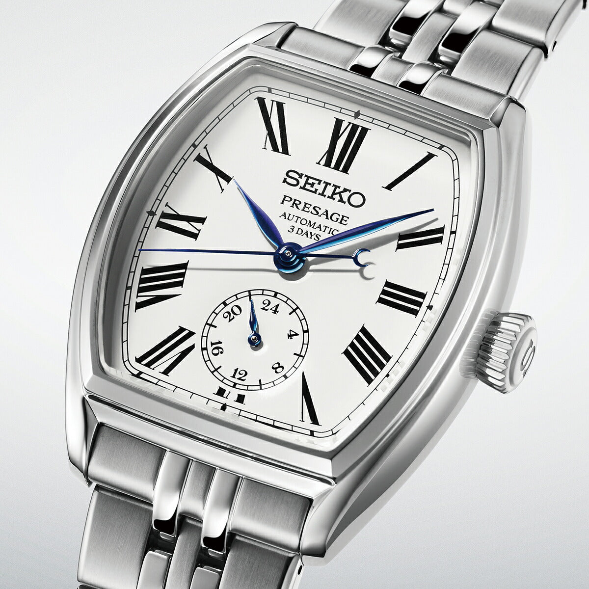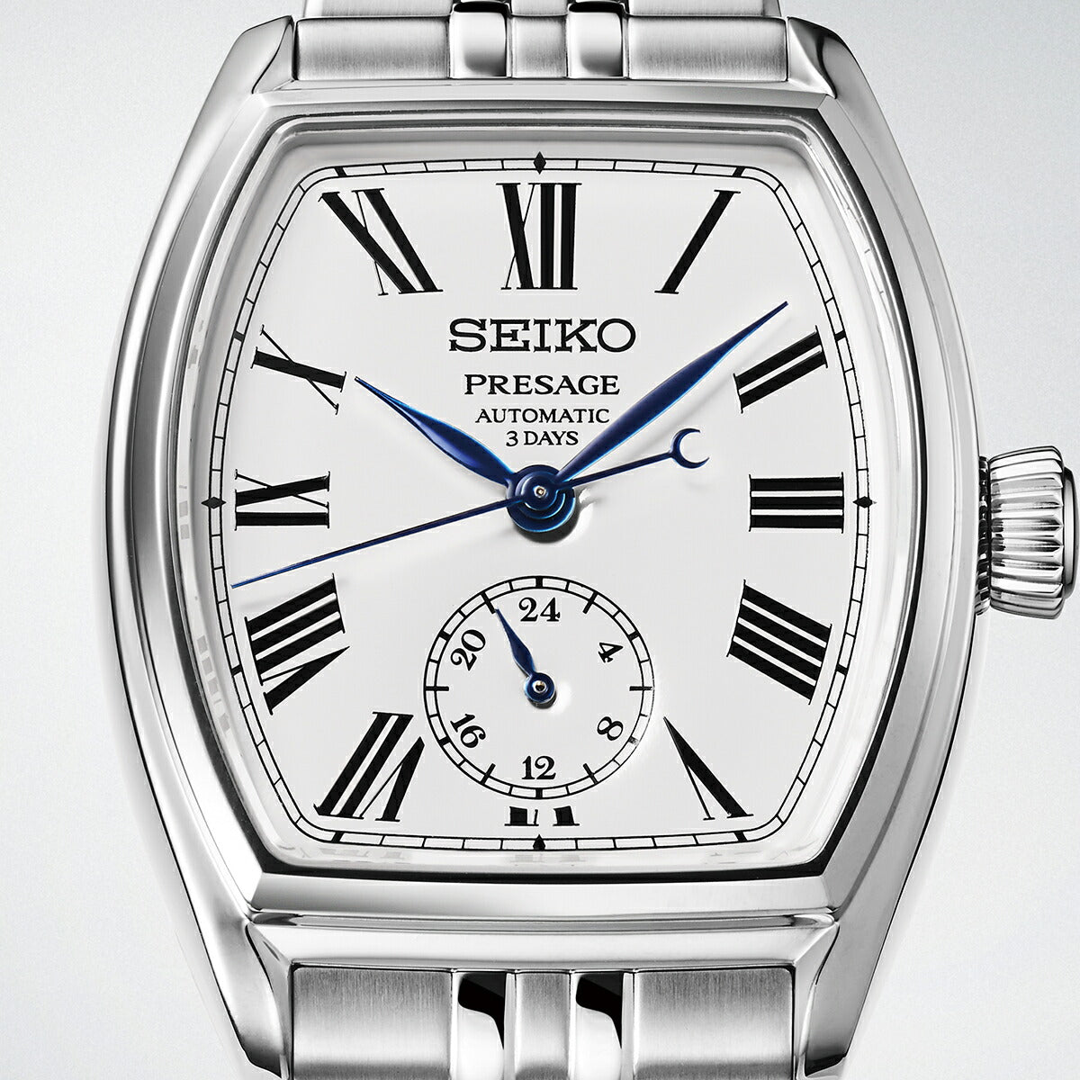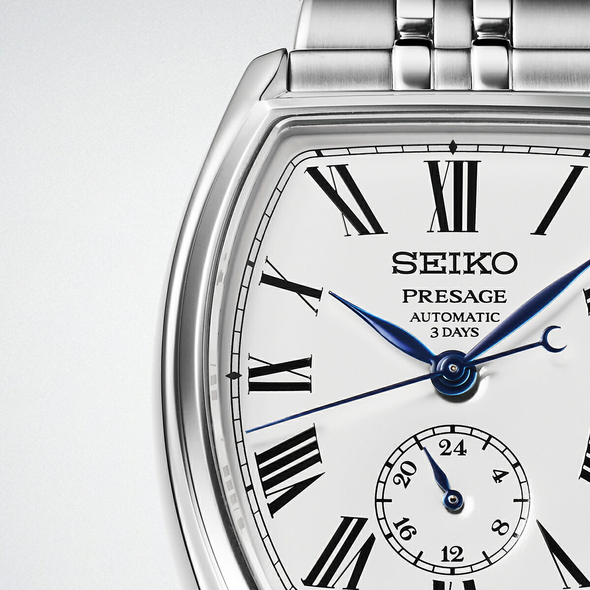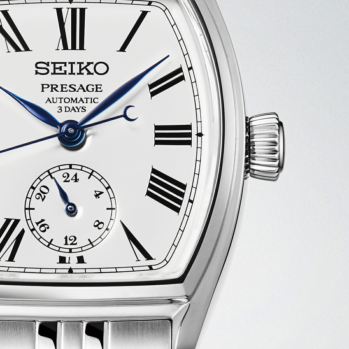 インデックスには、セイコー創成期の懐中時計「タイムキーパー」をオマージュしたローマ数字を配置。従来モデルから書体をアップデートし、トノー形ケースにふさわしい力強さとクラシカルな雰囲気を両立しています。ブルースチールの針が、白い琺瑯ダイヤルに美しく映え、上品なアクセントに。