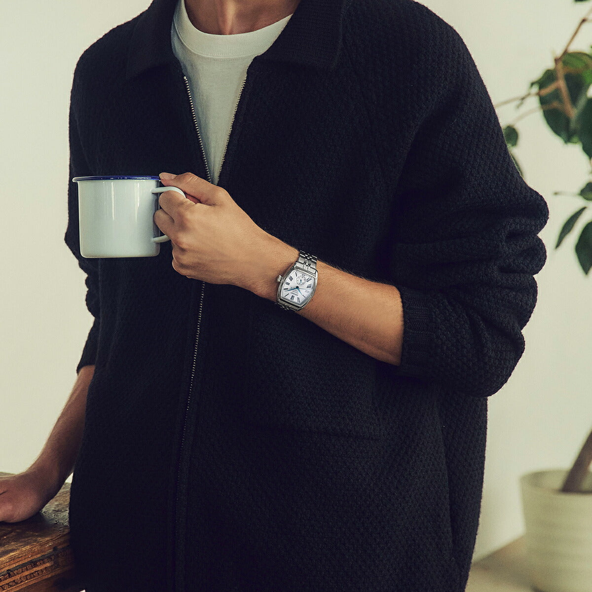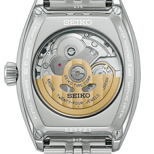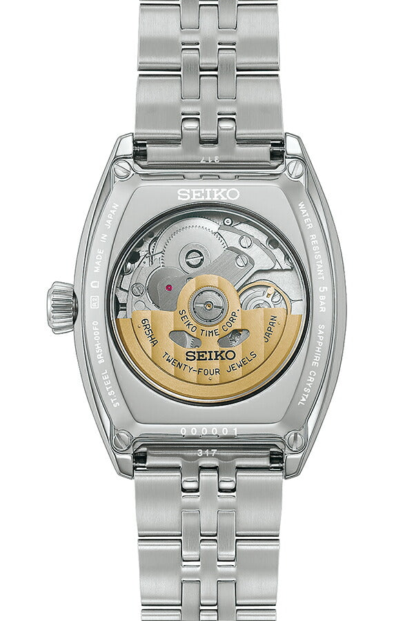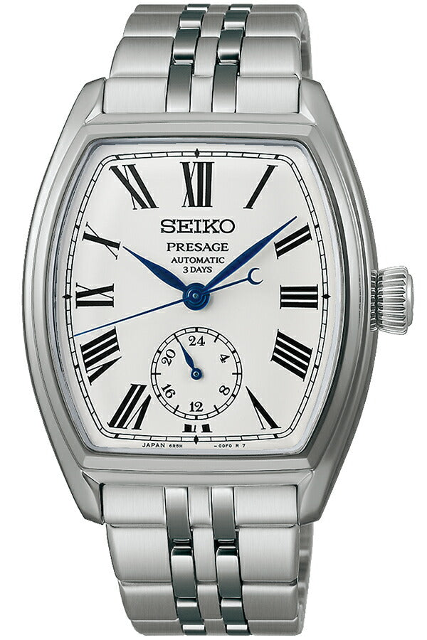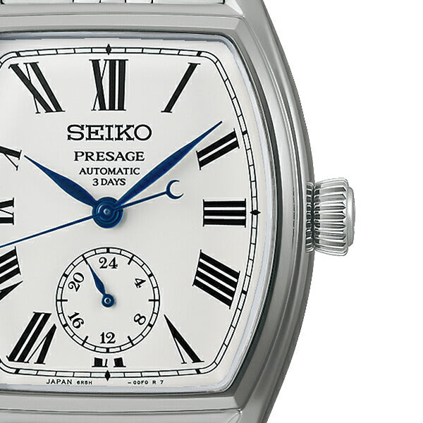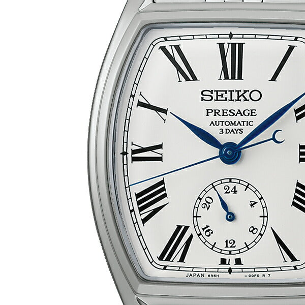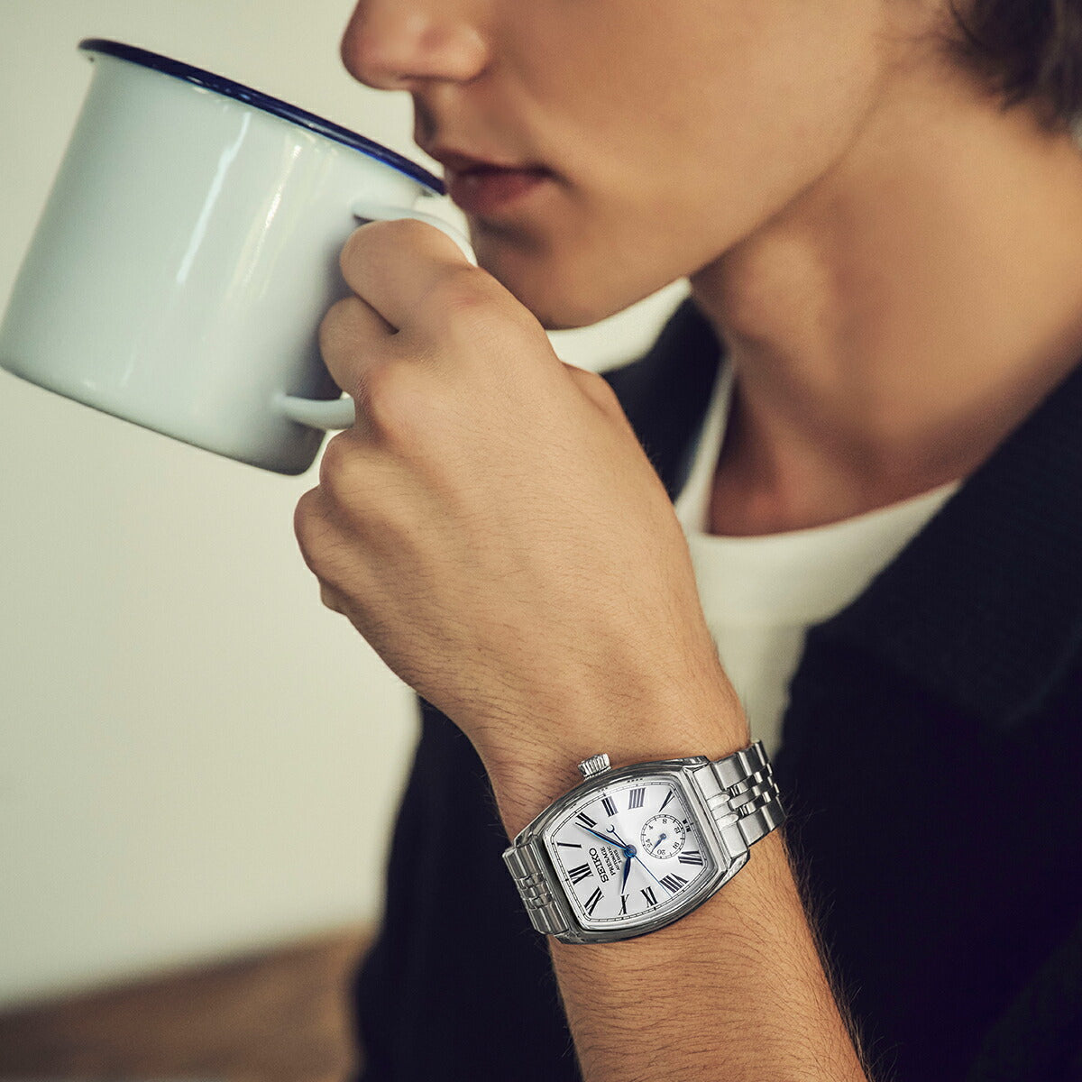 インデックスには、セイコー創成期の懐中時計「タイムキーパー」をオマージュしたローマ数字を配置。従来モデルから書体をアップデートし、トノー形ケースにふさわしい力強さとクラシカルな雰囲気を両立しています。ブルースチールの針が、白い琺瑯ダイヤルに美しく映え、上品なアクセントに。
