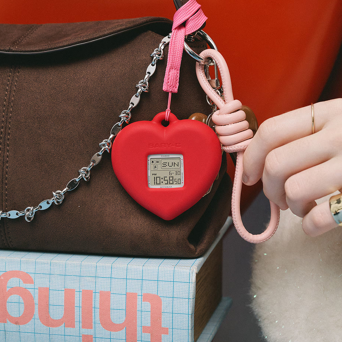 自分の好みに合わせて使い方が楽しめる「BABY-G+PLUS」シリーズから、ハート型の時計ホルダーを採用したポップなモデルです。