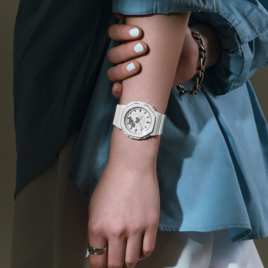 人気のアナログ・デジタルコンビネーションシリーズからベゼルの内側と外側からのぞくメタリックリングが印象的なモデルが仲間入り。GMA-P2100シリーズと同等のサイズ・装着感でありながら、メタリックパーツのさりげない輝きが高級感や洗練さを演出しています。