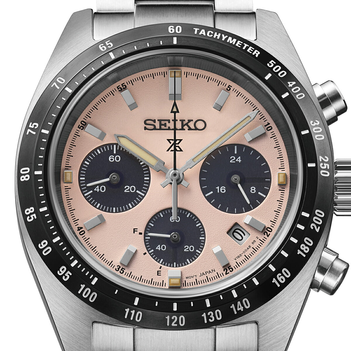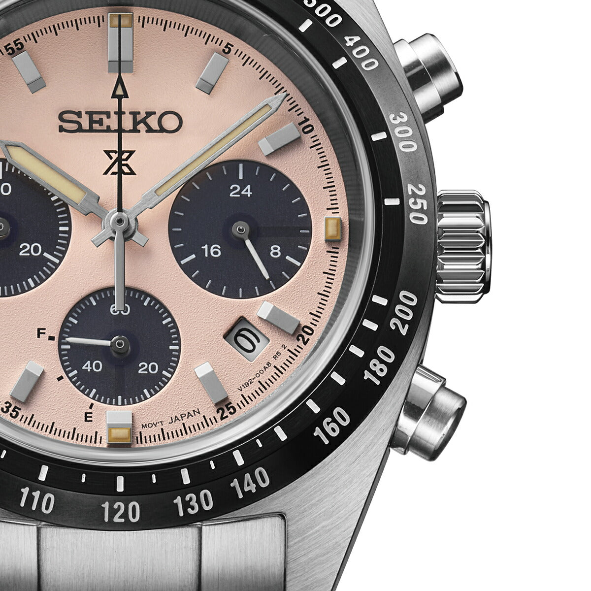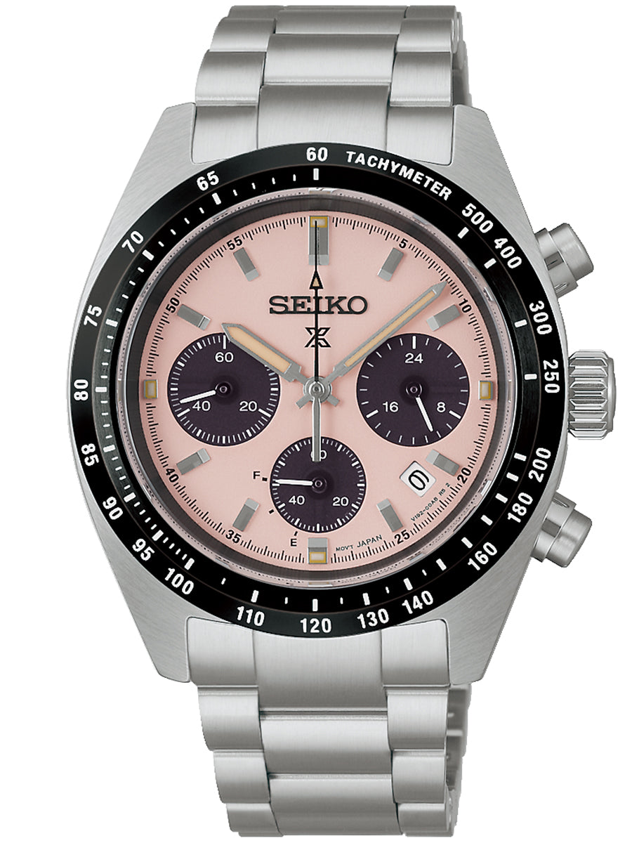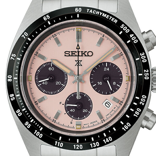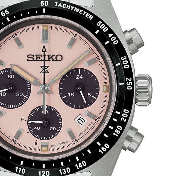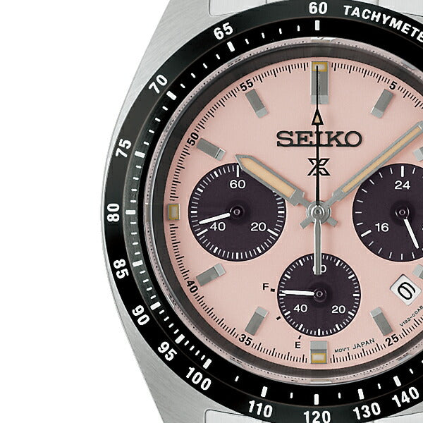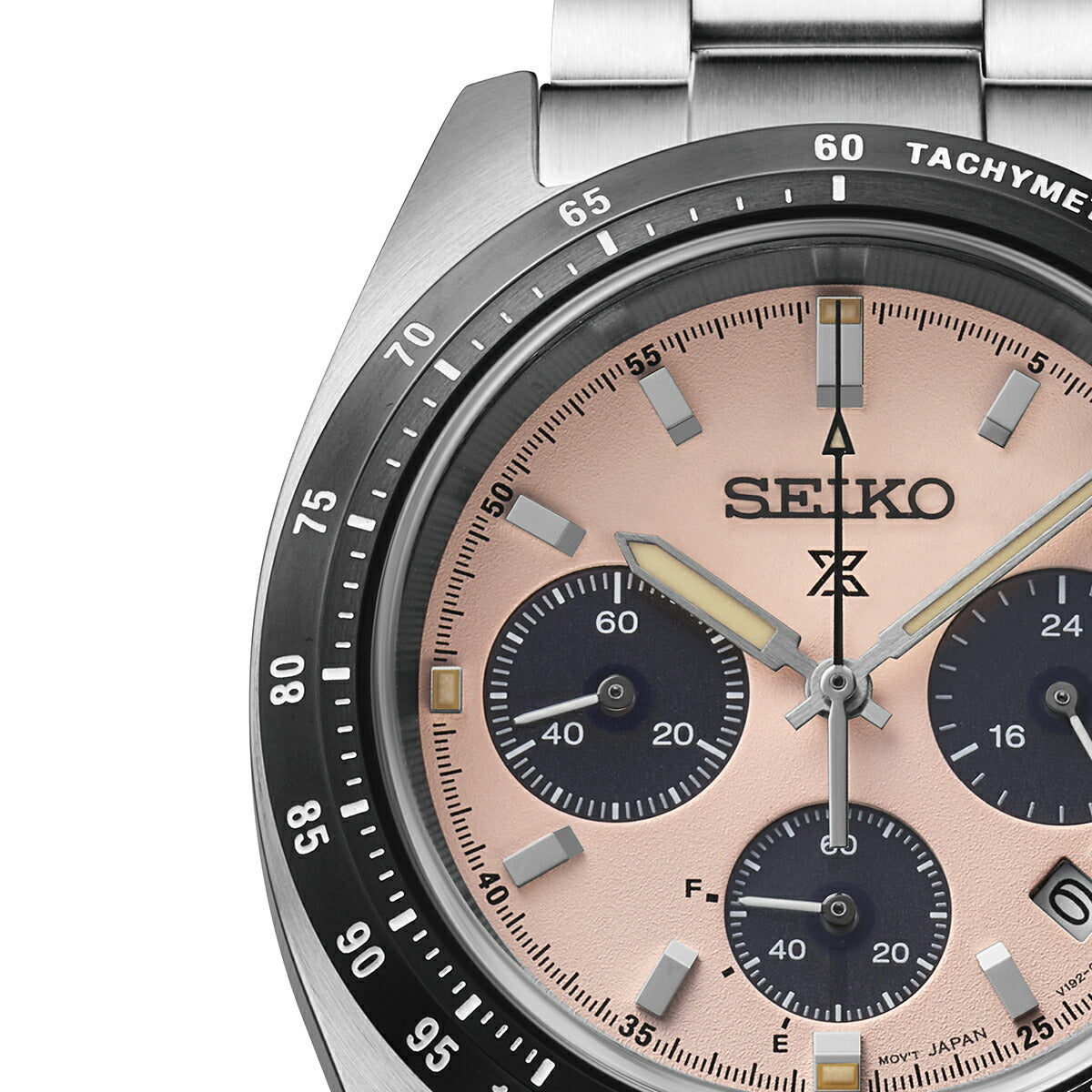 ダイヤルには、光の反射を抑える砂目調のパターンを採用。直射日光下でも高い視認性を確保し、本格スポーツウオッチとしての信頼感をしっかりと感じさせます。タキメーターベゼルやクロノグラフのレイアウトも、計器としての役割を直感的に理解できるデザインで、機能美を大切にするセイコーらしさが随所に表れています。