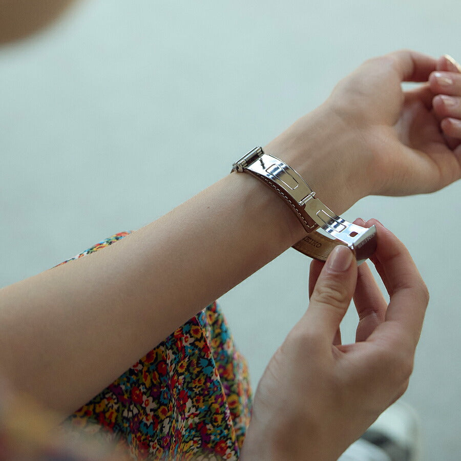 31mmのコンパクトなケースは、ボックス型ガラスと厚みのある裏ぶたで立体感を演出。側面に施された緩やかなカーブが手元に自然に馴染み、日常使いに最適な快適さを実現しています。