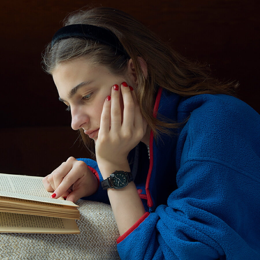 艶やかなブラックダイヤルに、ピンクゴールドカラーのインデックスと針を組み合わせたシックなデザイン。深みのあるトーンの中に上品なアクセントが映え、カジュアルにもフォーマルにもマッチします。