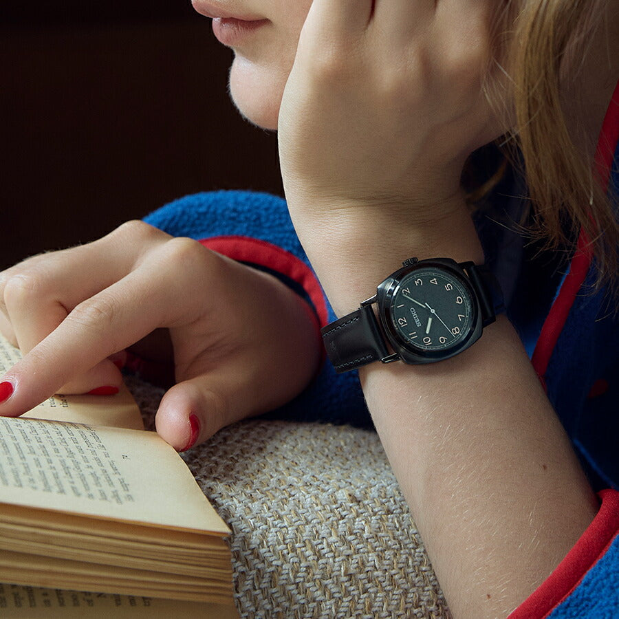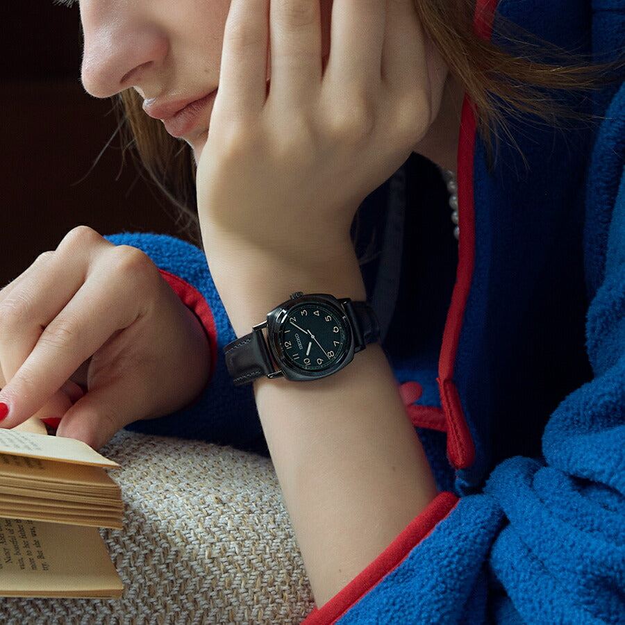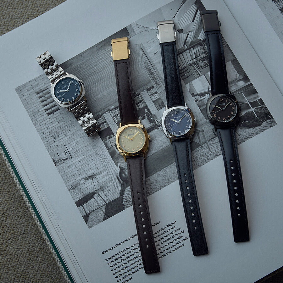クッションケースの柔らかなフォルムと、わずかに膨らんだカーブガラスがヴィンテージ感を演出。1960~70年代のSEIKOアーカイブフォントを採用したアラビア数字インデックスが、クラシカルで可愛らしい印象を与えます。