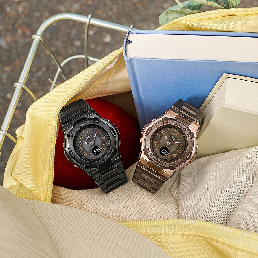 アクティブな女性のためのカジュアルウオッチ BABY-Gから、どんな服装にも合わせやすいダークカラーを纏った電波ソーラーモデルです。