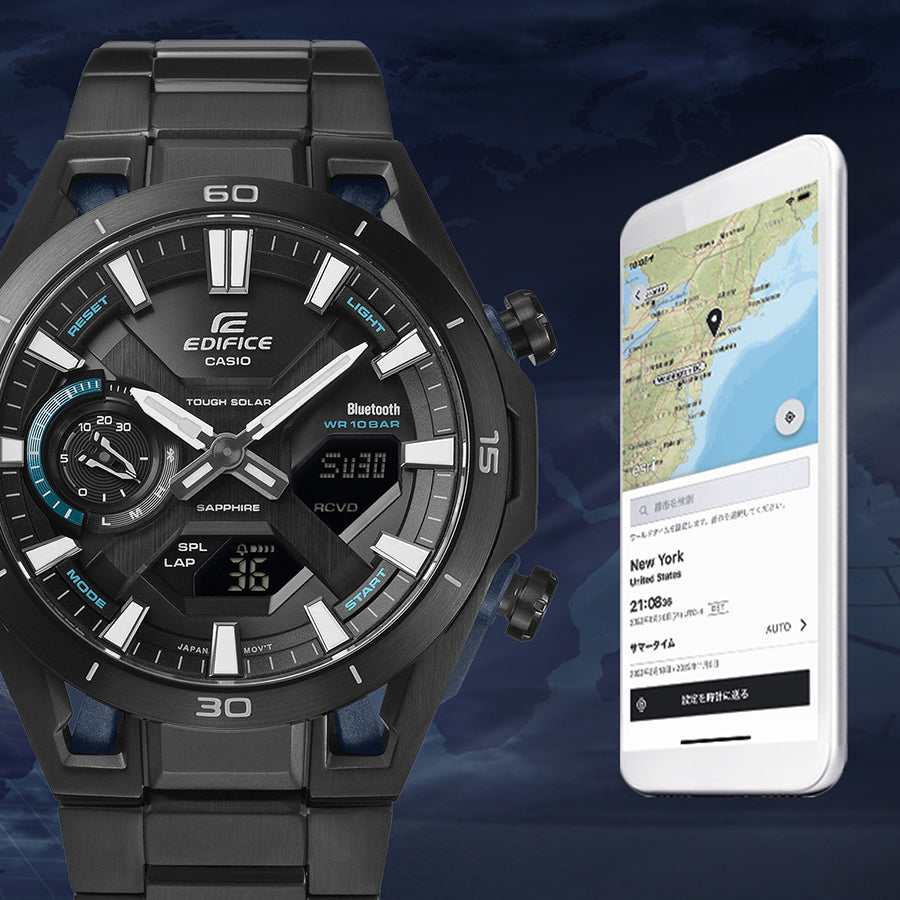 機能面も充実。Bluetooth®搭載によりスマートフォンと連携し、正確な時刻調整やワールドタイム設定などをアプリから簡単に操作可能。タフソーラーによる安定した電源供給、傷に強いサファイアガラス、実用的な10気圧防水など、高い実用性も備えています。
