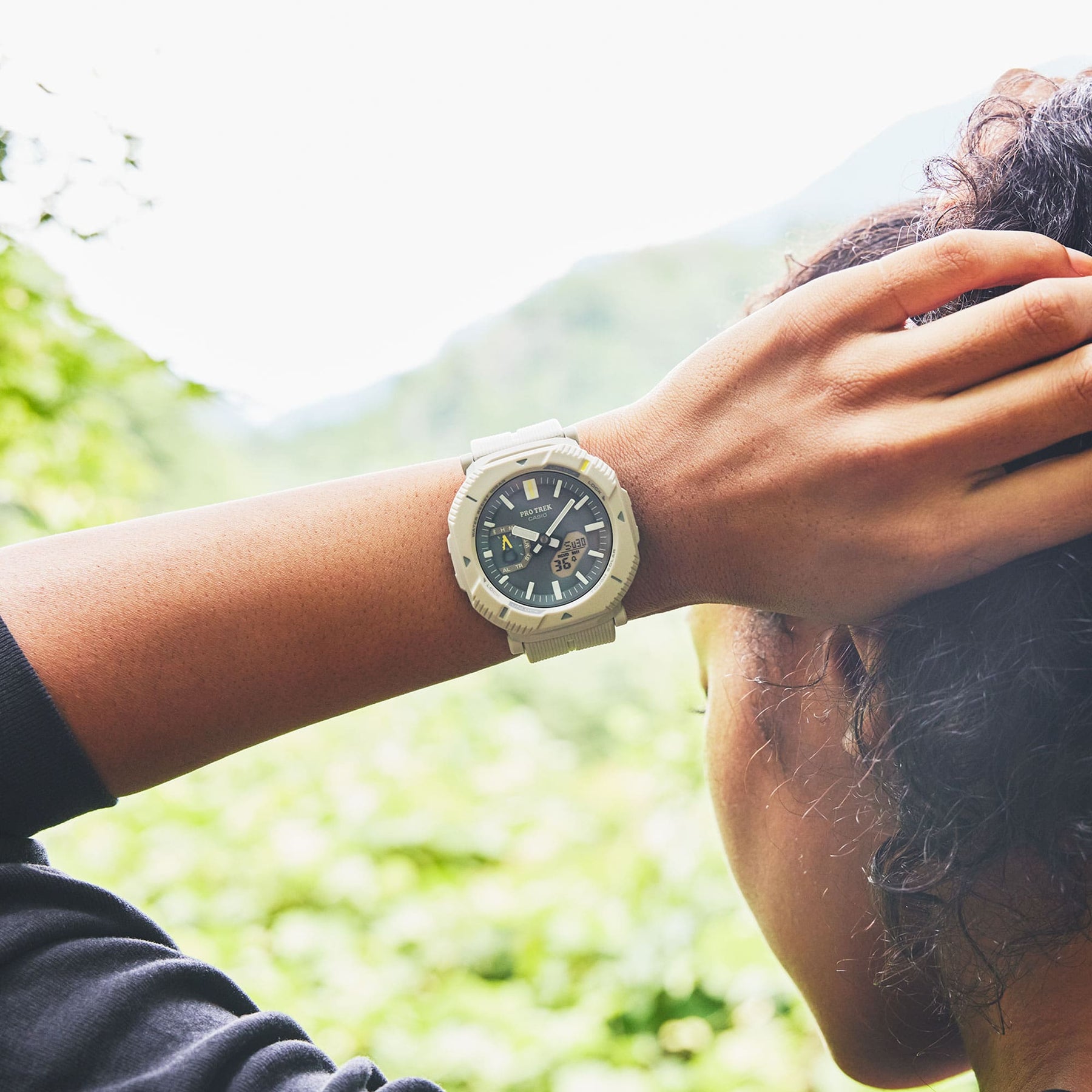 ケース、バンドなどの主な樹脂パーツには環境配慮型のバイオマスプラスチックを使用。加えて、タフソーラーやBluetooth®を搭載し、スマートフォン連携も可能です。