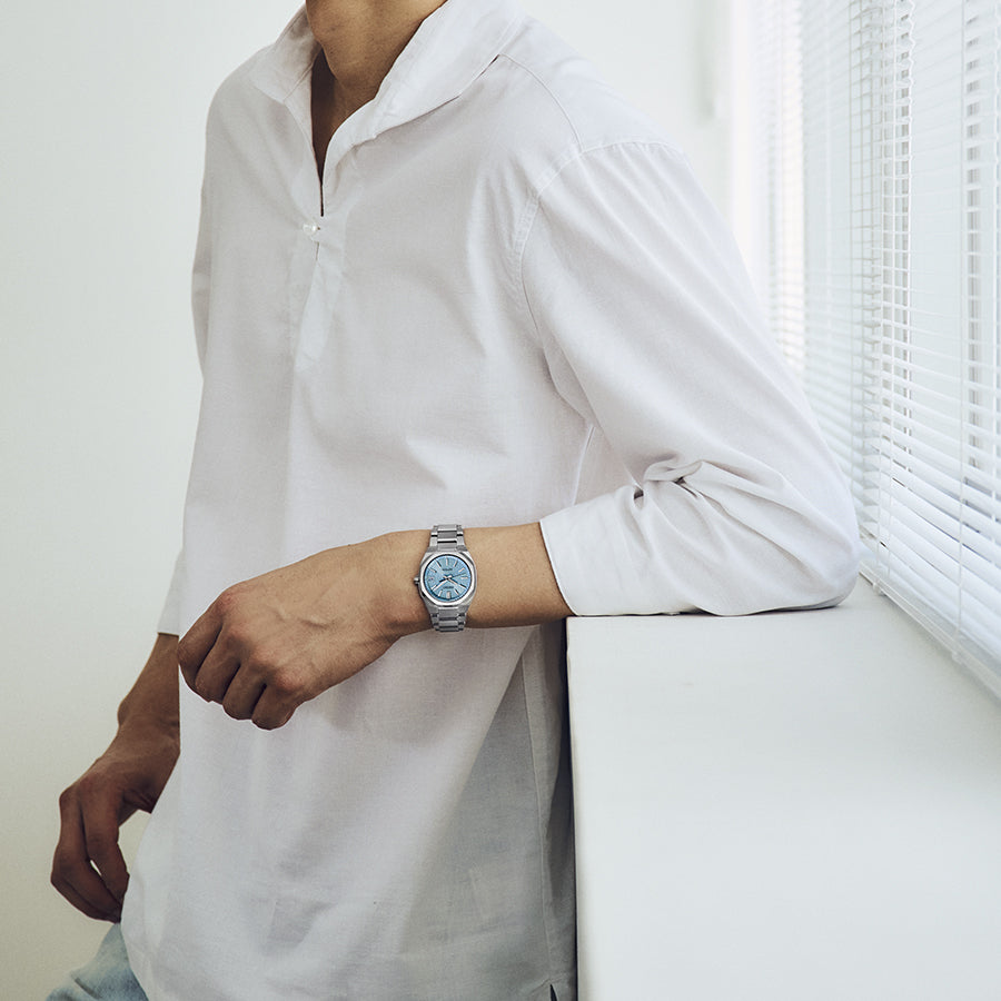 ダイヤルには、クリスタルボックスパターンを施した精緻なテクスチャーを採用。三面カットの時分針や多面カットインデックスが光を受け、コンパクトながら高級感あふれる表情を見せます。さらに、スマートアジャスター機構付きの新設計中留により、細やかなサイズ調整も可能です。