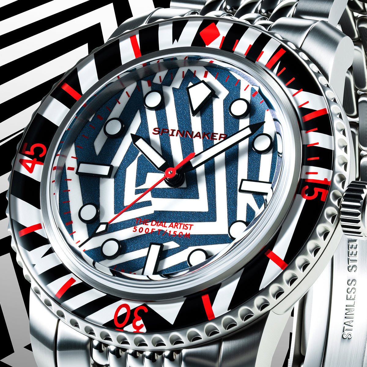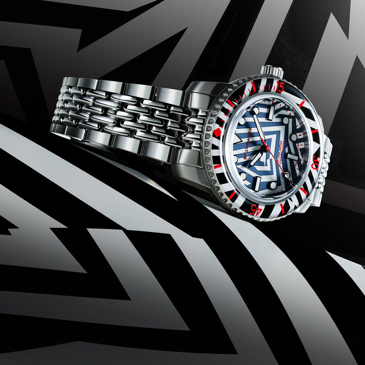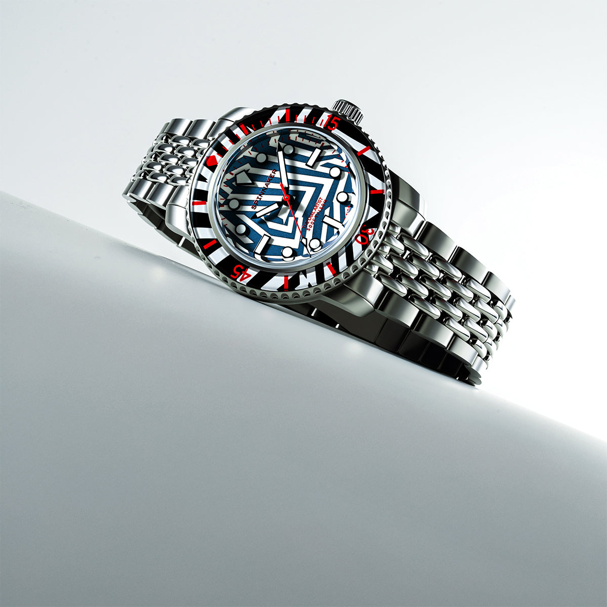 艦船に施される迷彩塗装「ラズルダズル(ダズル)」柄を大胆に落とし込んだ、スピニカーの限定モデルが登場。第一次世界大戦中に敵艦を惑わせるために生み出されたこの幾何学的な迷彩パターンを、あえて腕時計のフェイス全面に採用するという挑戦的な一本です。
