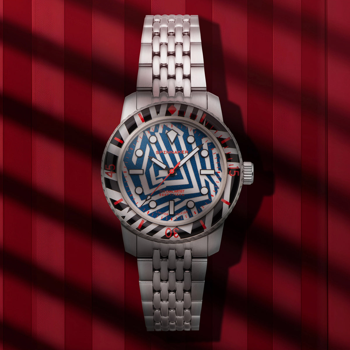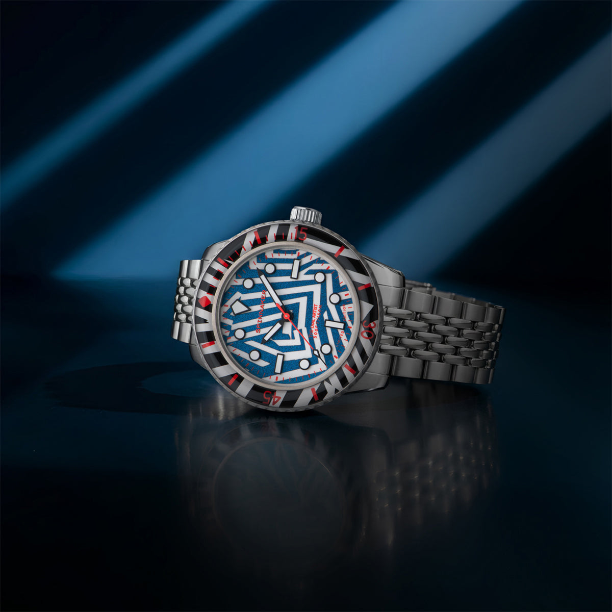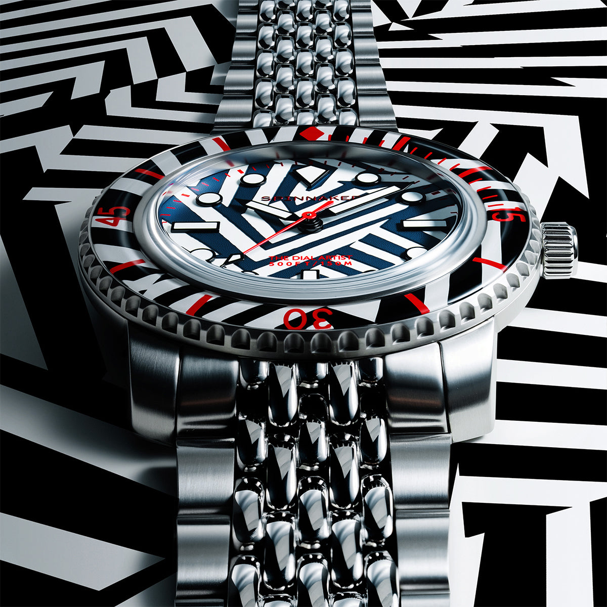 艦船に施される迷彩塗装「ラズルダズル(ダズル)」柄を大胆に落とし込んだ、スピニカーの限定モデルが登場。第一次世界大戦中に敵艦を惑わせるために生み出されたこの幾何学的な迷彩パターンを、あえて腕時計のフェイス全面に採用するという挑戦的な一本です。