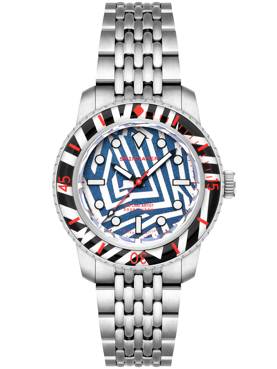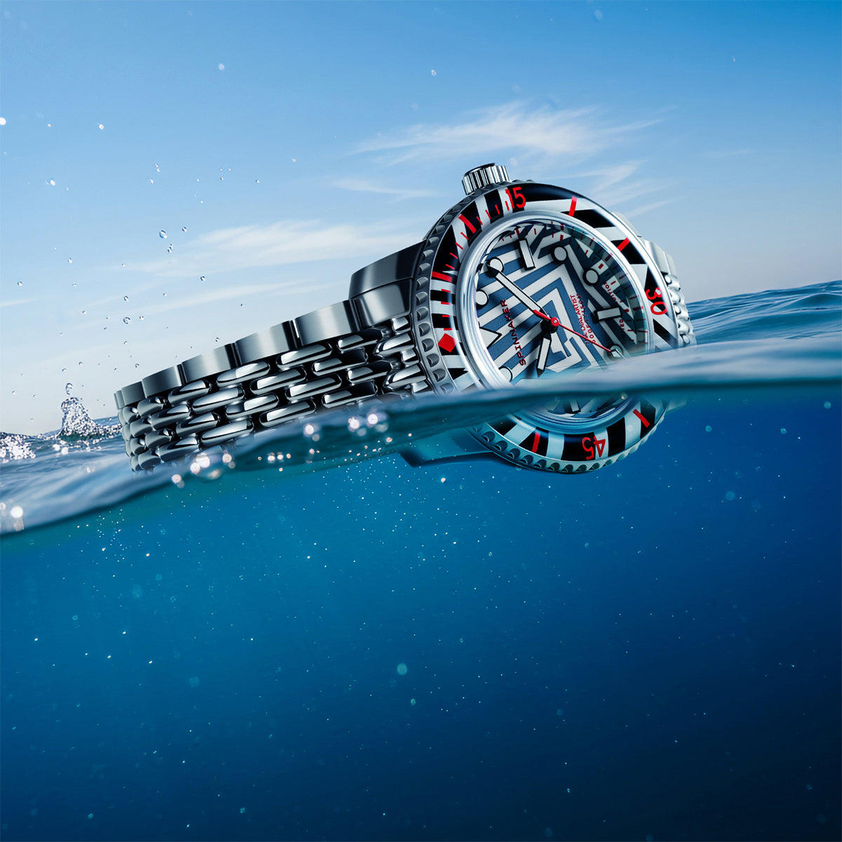 文字盤手作業アーティストとして名高いChris Alexander氏とのコラボレーションモデルでもあり、複雑に入り組んだラインとコントラストの効いた配色が、まるでアートピースのような存在感を演出します。ベゼルにも大胆なパターンと差し色を施し、海を想起させるダイバーズスタイルとアート性を融合させた仕上がりです。