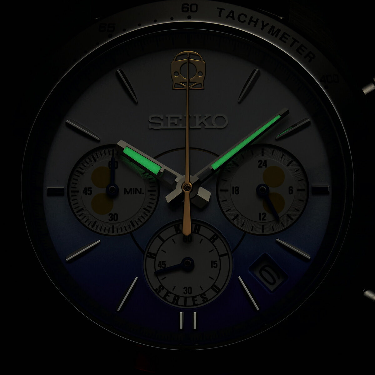 青と白のツートンカラーが印象的な0系のイメージを、美しいグラデーションの文字盤に表現。左右のインダイヤルには、長年親しまれてきた愛嬌のある正面顔にちなみ、縦に2つ並んだ0系独特の前照灯がデザインされています。高度成長期を駆け抜けた夢の超特急0系に心を寄せる時の記念碑として、今こそ手にしておきたい特別モデルです。