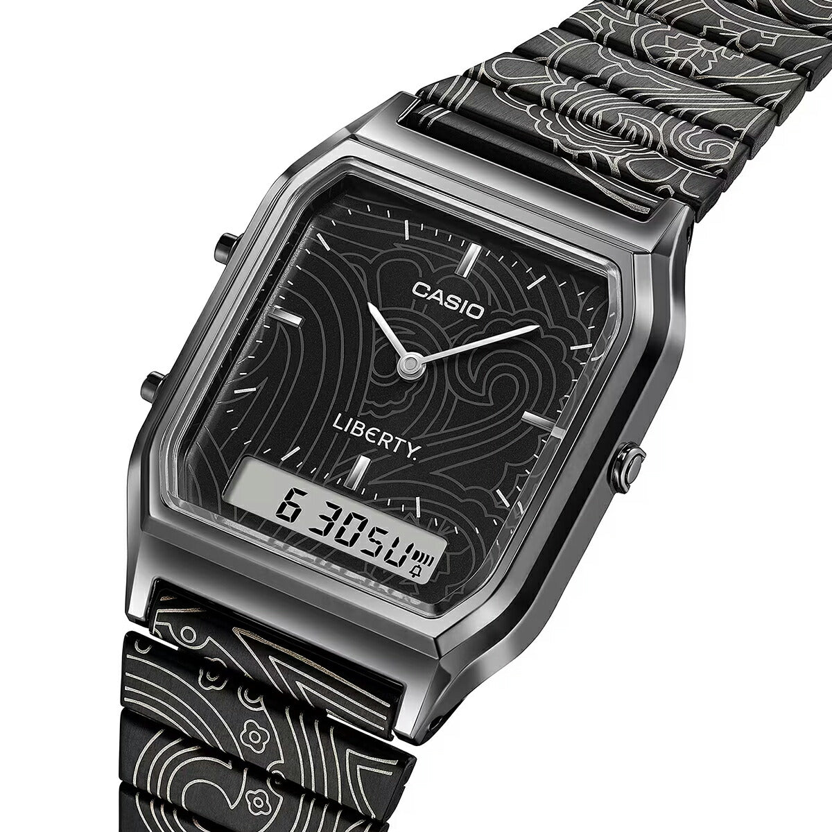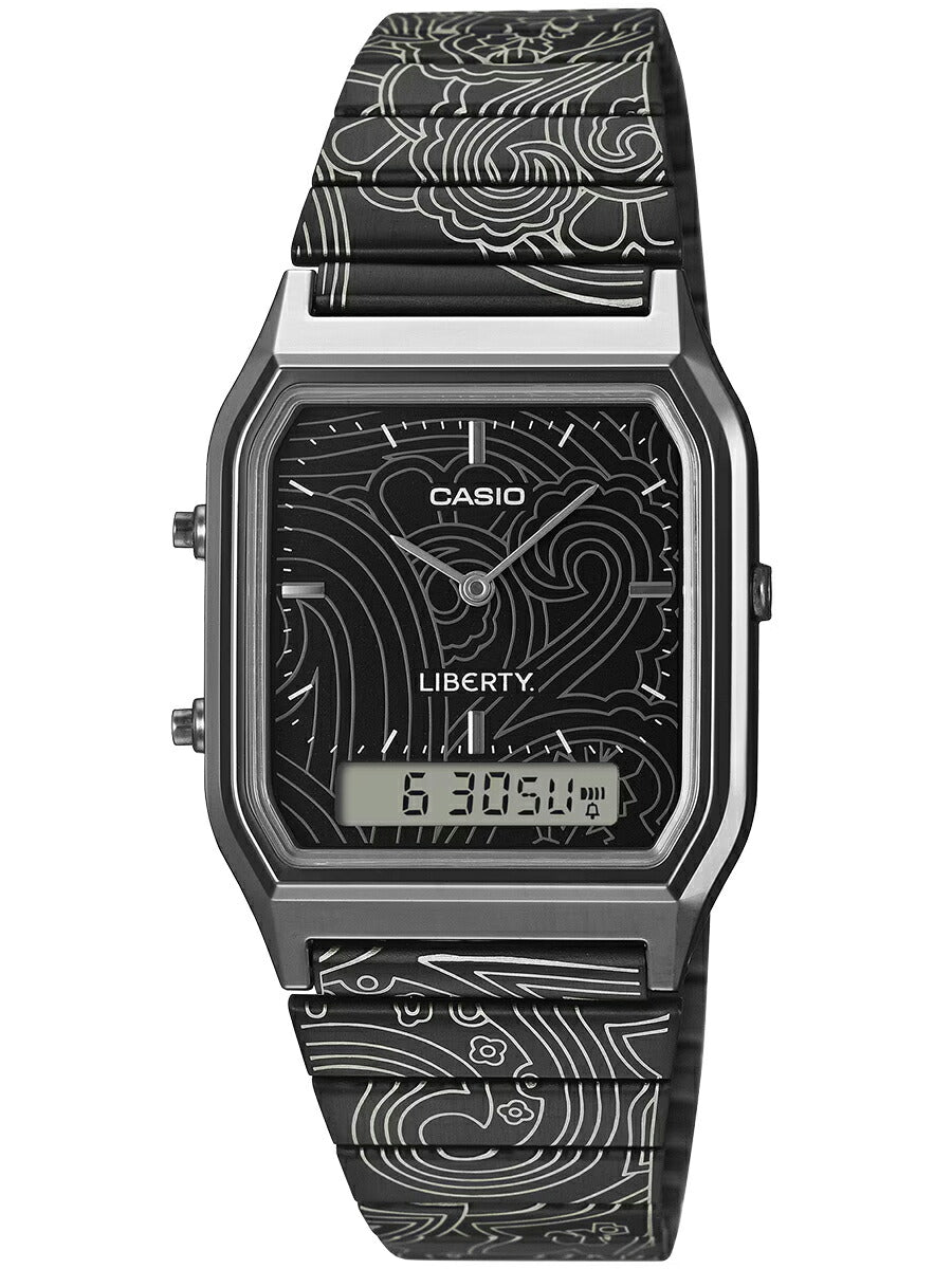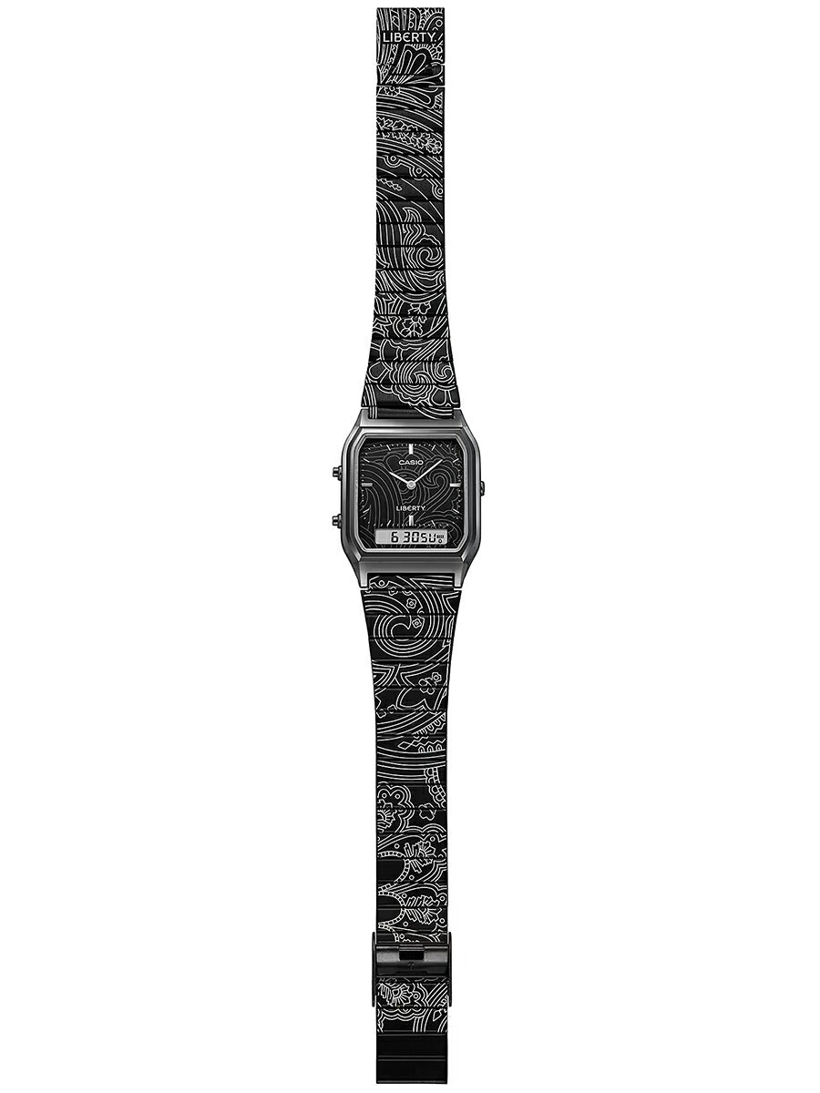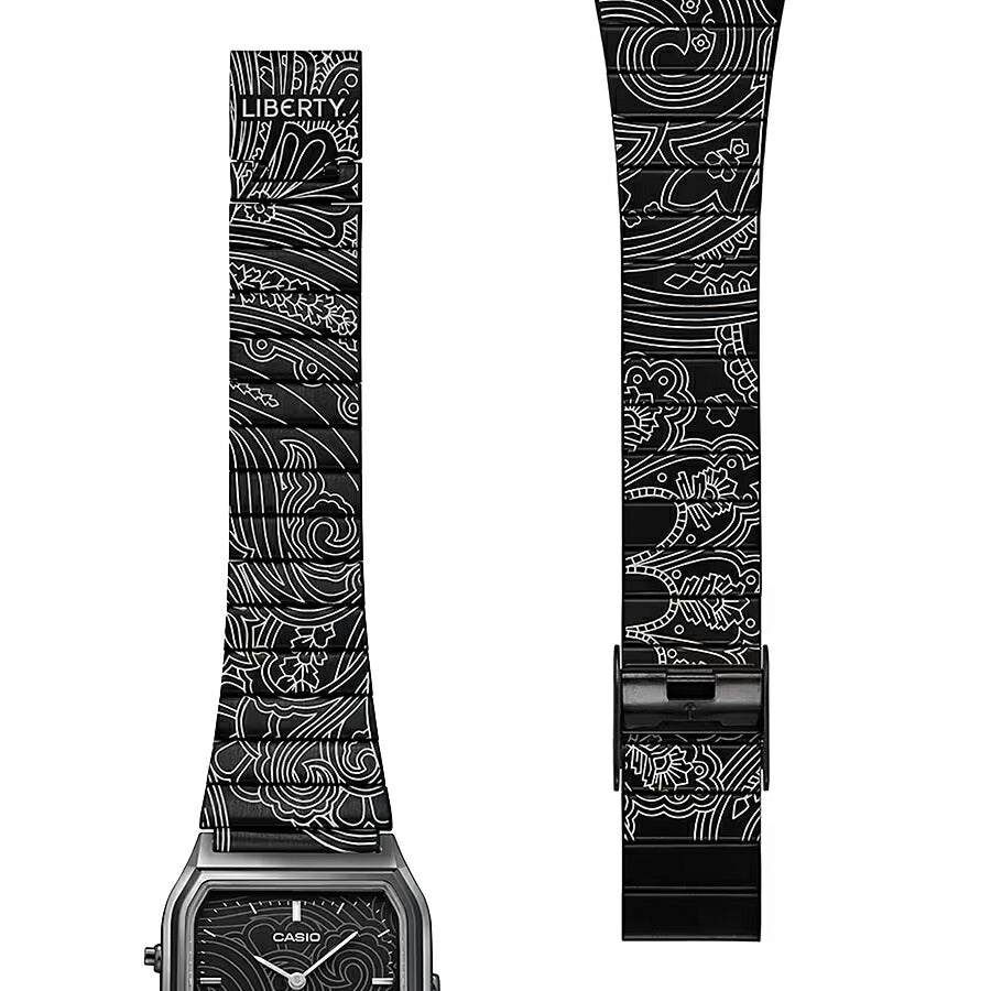 ベースモデルには角型フェイスにアナログ時計とデジタル表示を組み合わせた人気のAQ-230を採用。リバティの代表的なペイズリーファンファーレにインスパイアされ、曲線が美しいクラシックなペイズリー柄をバンドと文字板にデザインしました。 レーザー刻印によって緻密に表現された柄が、繊細な美しさを添えています。