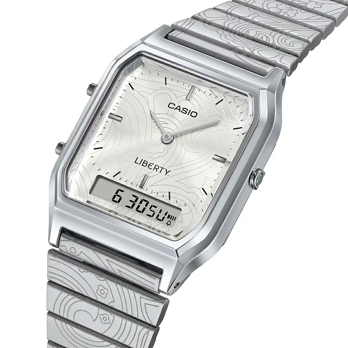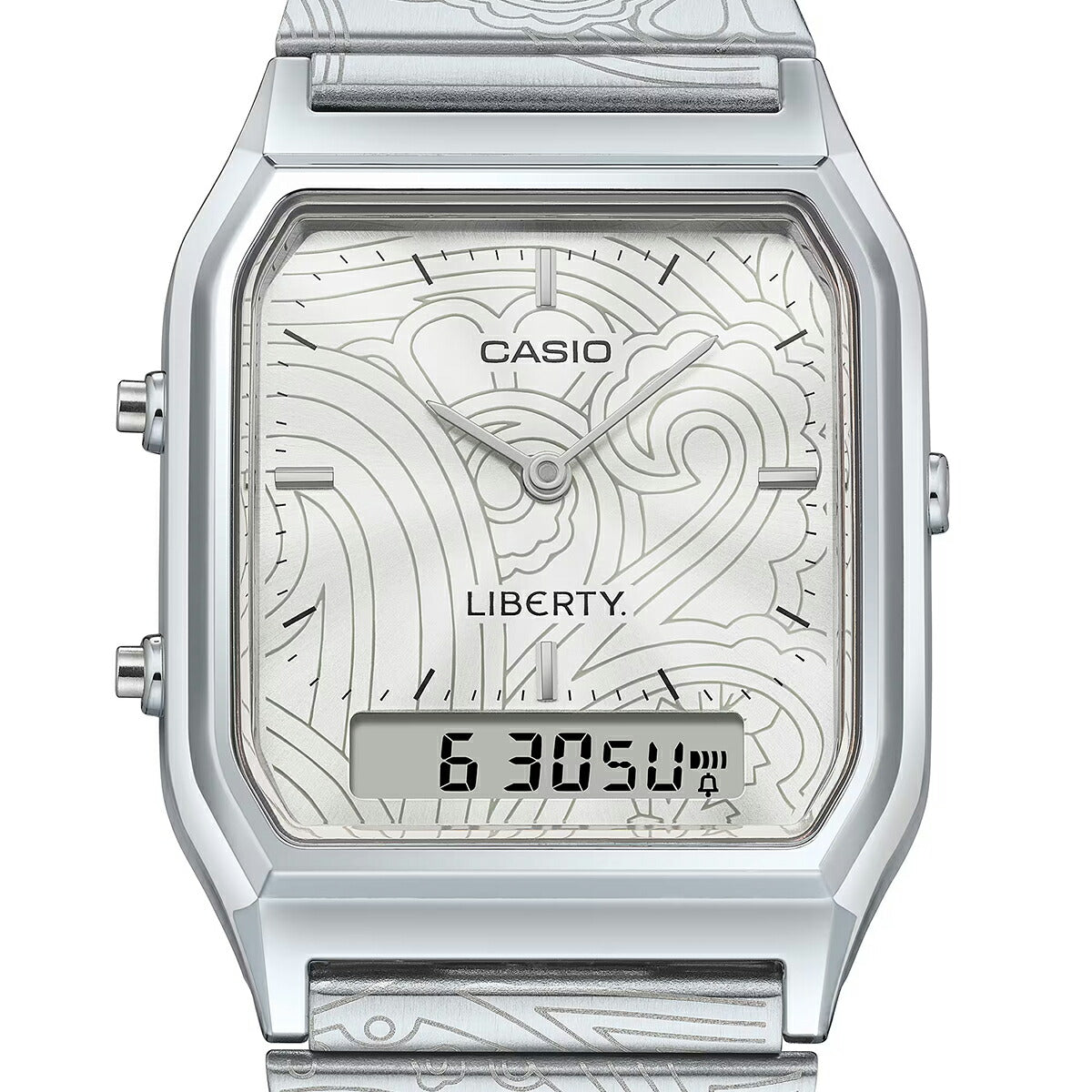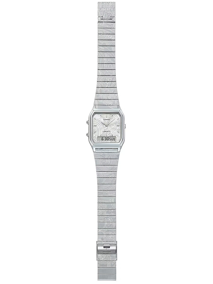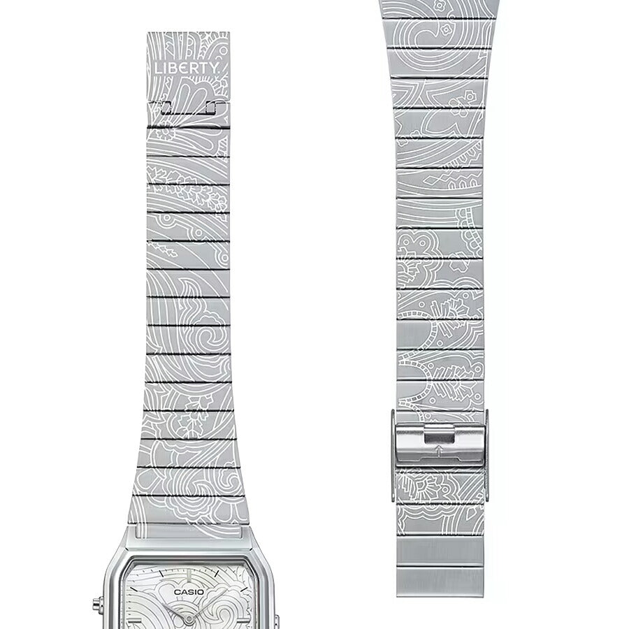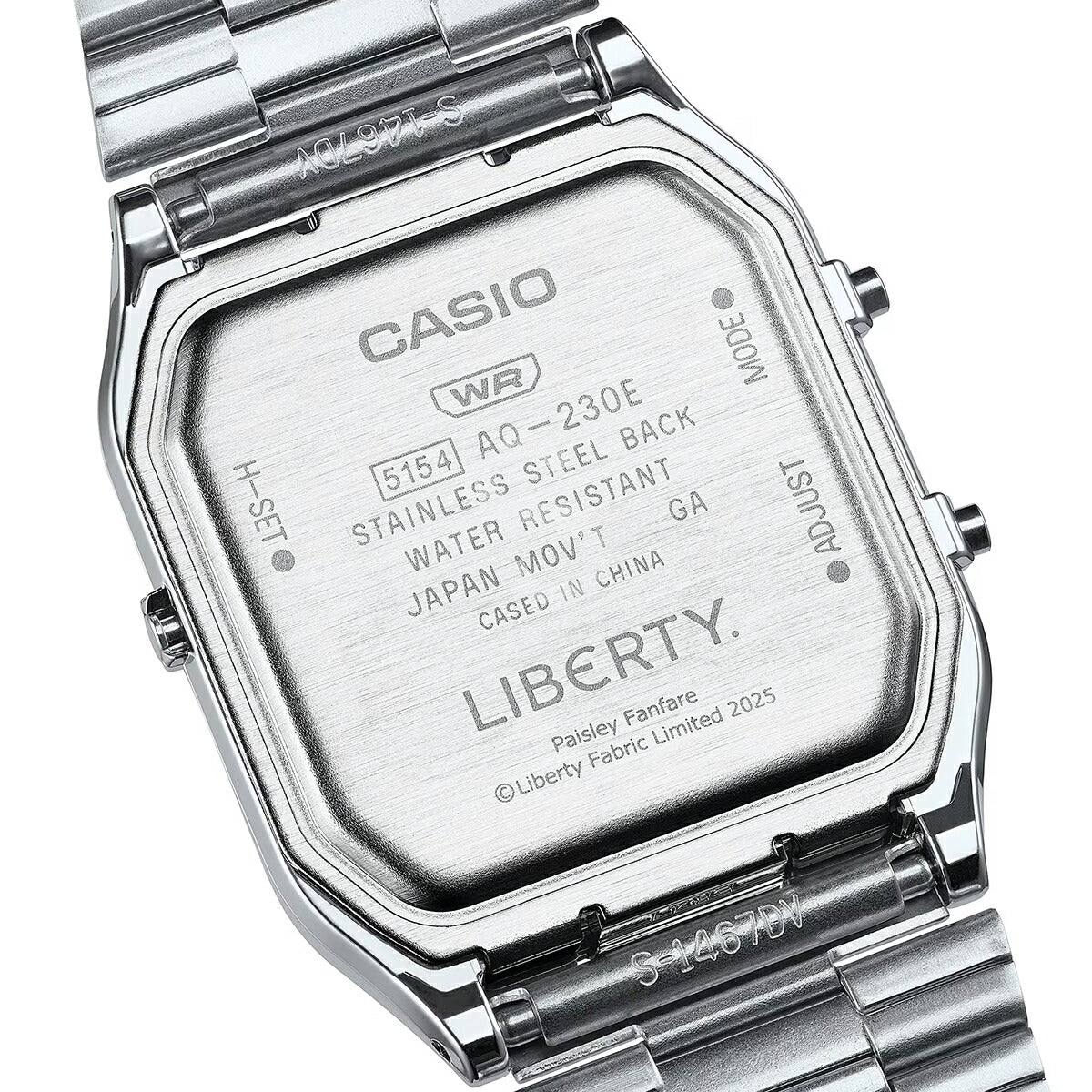 ベースモデルには角型フェイスにアナログ時計とデジタル表示を組み合わせた人気のAQ-230を採用。リバティの代表的なペイズリーファンファーレにインスパイアされ、曲線が美しいクラシックなペイズリー柄をバンドと文字板にデザインしました。 レーザー刻印によって緻密に表現された柄が、繊細な美しさを添えています。
