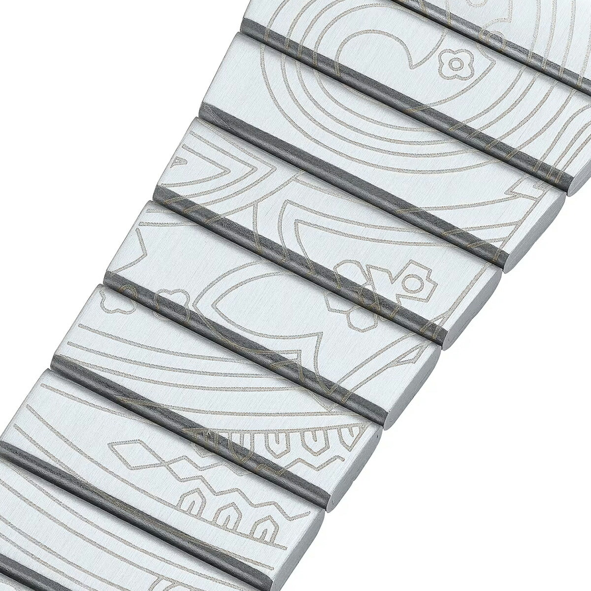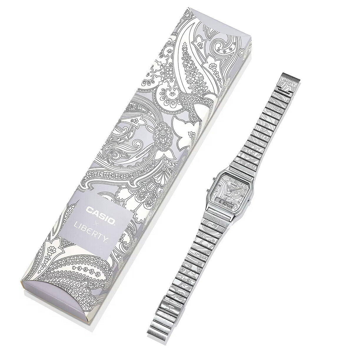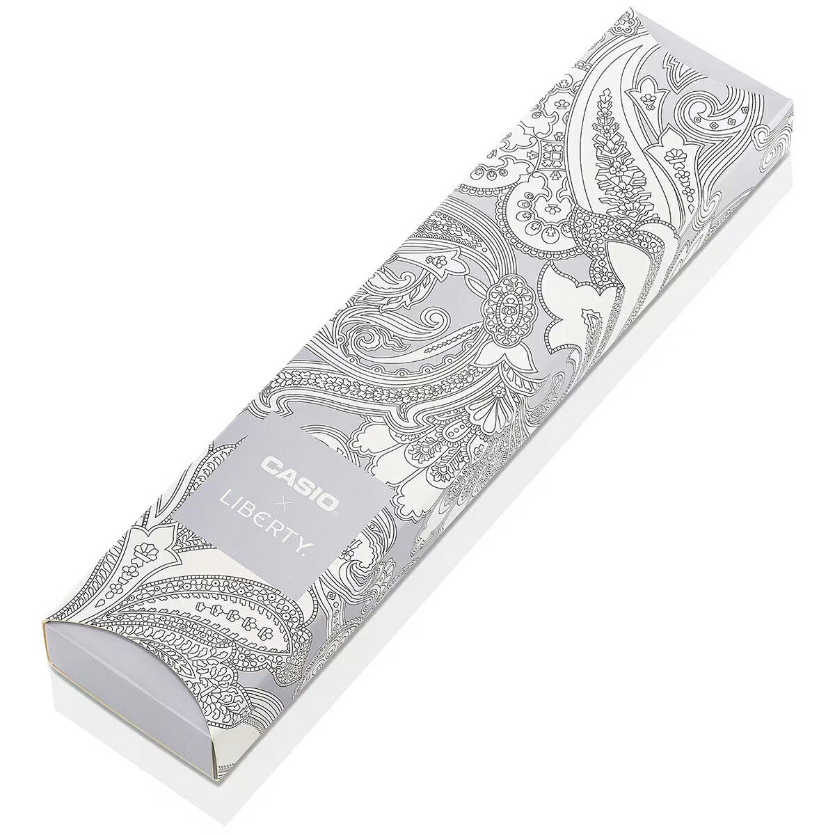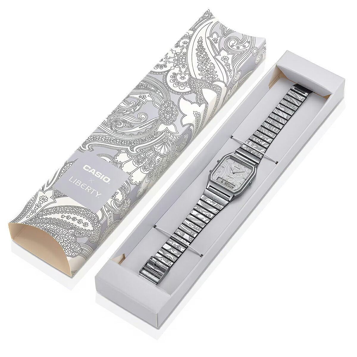 ベースモデルには角型フェイスにアナログ時計とデジタル表示を組み合わせた人気のAQ-230を採用。リバティの代表的なペイズリーファンファーレにインスパイアされ、曲線が美しいクラシックなペイズリー柄をバンドと文字板にデザインしました。 レーザー刻印によって緻密に表現された柄が、繊細な美しさを添えています。